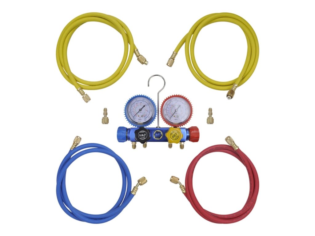 Táto kompletná sada náradia pre chladiace kvapaliny obsahuje vákuové čerpadlo s meradlom a 4-cestnou súpravou potrubných meradiel v tvarovanom puzdre.