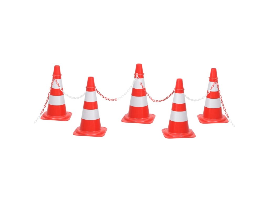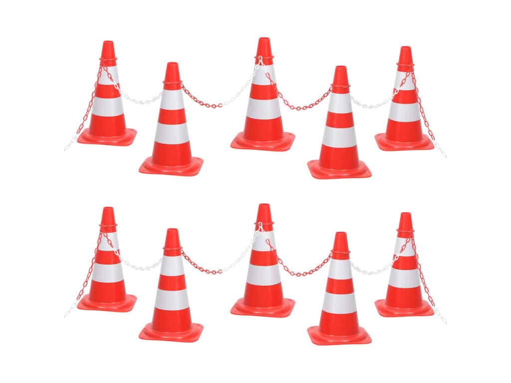 Plastová reťaz s dĺžkou 10 m sa dá ľahko pripevniť na dopravné kužele pomocou priložených horných spojok a vytvoriť tak vymedzený priestor. Súprava má nízku hmotnosť, a preto je veľmi dobre prenosná. Vďaka jasným farbám je sada dopravných kužeľov dobre viditeľná aj pri slabom osvetlení.