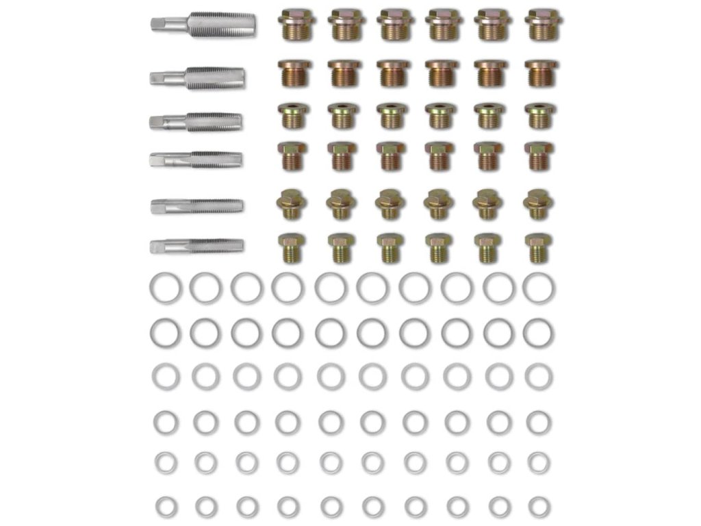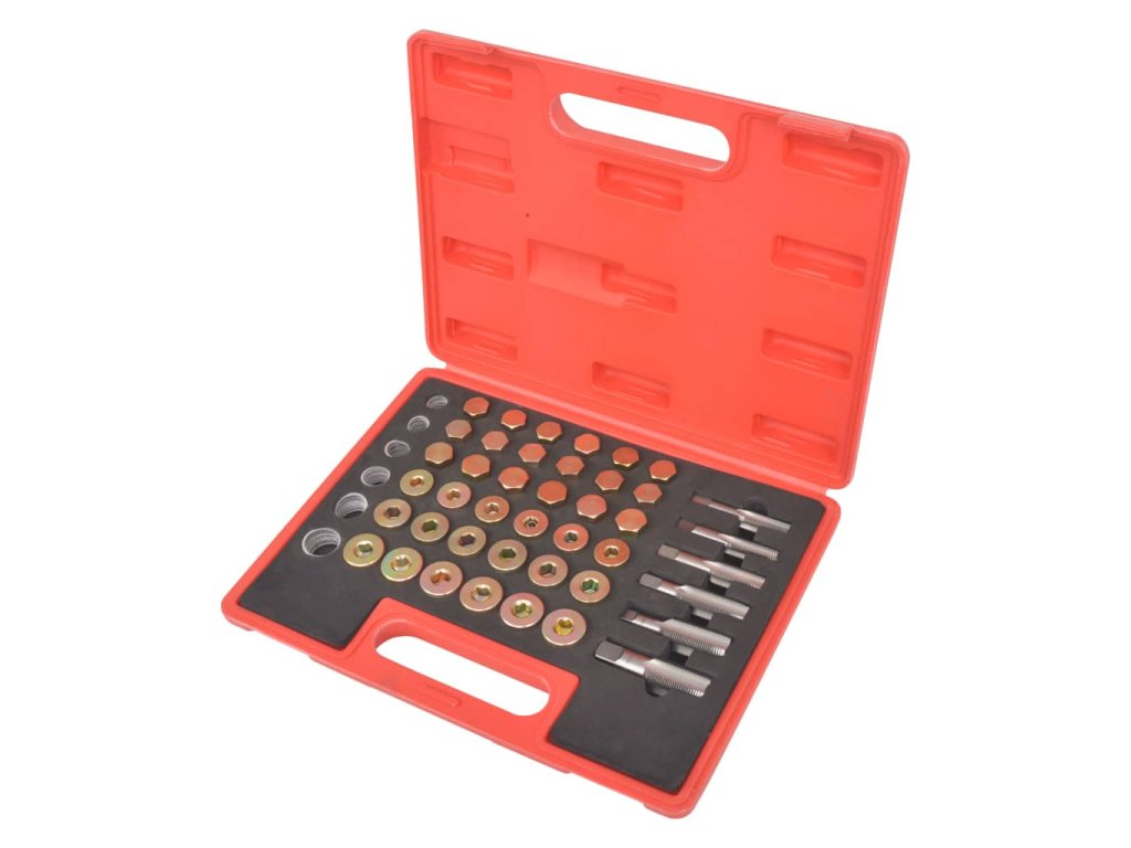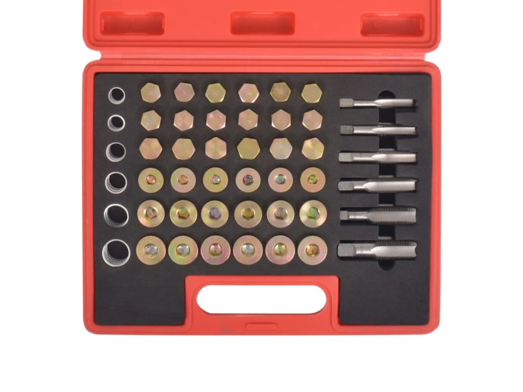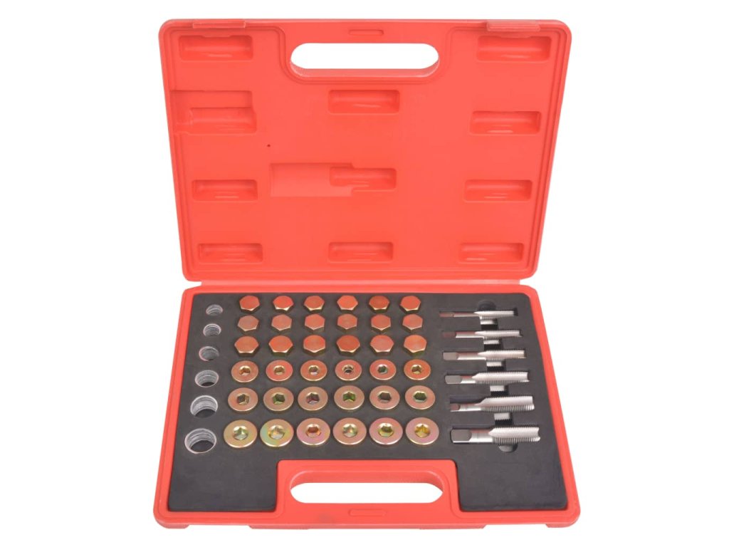 Táto komplexná sada na opravu závitov a vypúšťacích zátok olejových vaní pozostáva zo závitov v šiestich veľkostiach, vypouštacích zátok a podložiek a má takmer univerzálne využitie. Sada je vhodná na opravu skrutiek olejvých vaní, prevodoviek, diferenciálov a podobne.