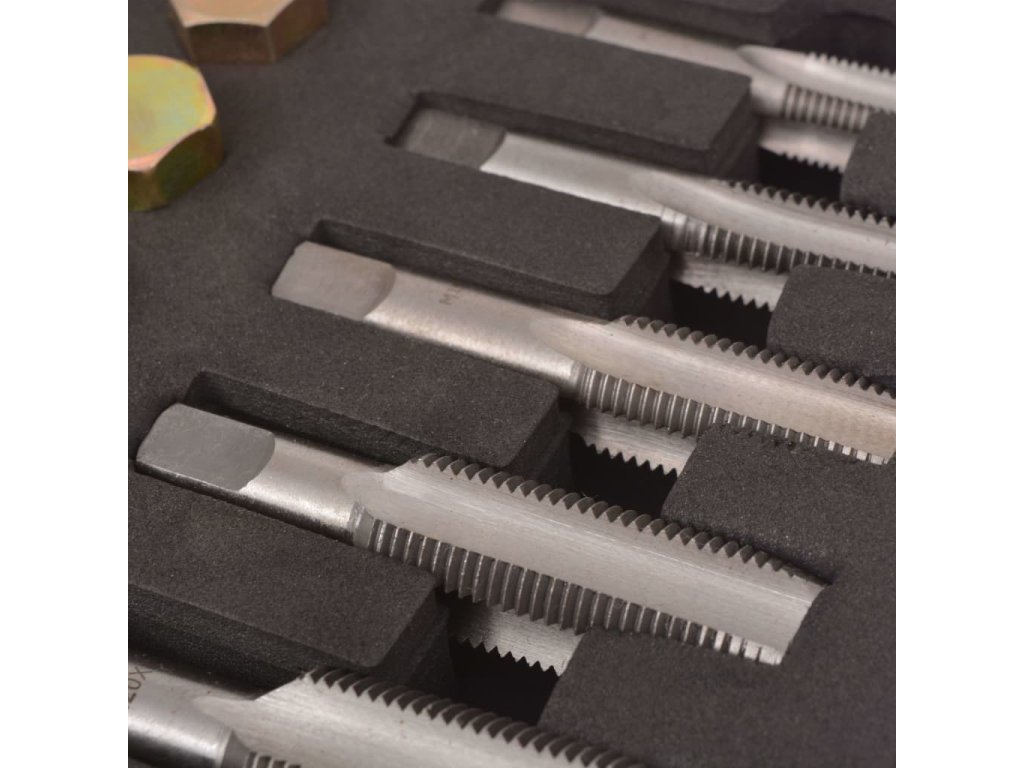 - 6 x Závity z HSS (vysokorýchlostná oceľ) 4341: M 13 x 1,25/M 13 x 1,5/M 15 x 1,5/M 17 x 1,5/M 20 x 1,5/M 22 x 1,5 (6 veľkosti, po 1 kuse z každej veľkosti)