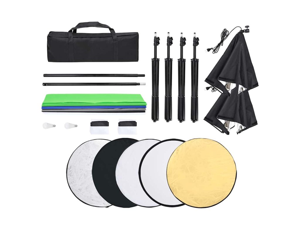 Táto všestranná osvetľovacia sada do fotoštúdia, ktorá obsahuje pozadia a softboxový osvetľovací systém s reflektorom 5-v-1, môže byť použitá na fotografovanie/natáčanie v štúdiu alebo mimo štúdia.