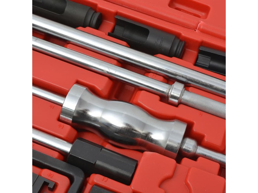 Sada sťahovákov vstrekovačov je vyrobená z vysoko kvalitnej ocele, čo zaručuje vynikajúcu trvácnosť. Všetky nástroje sú dodávané v robustnom kufríku pre ľahké skladovanie a prepravu.