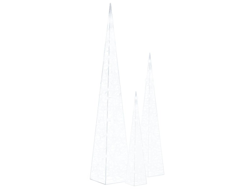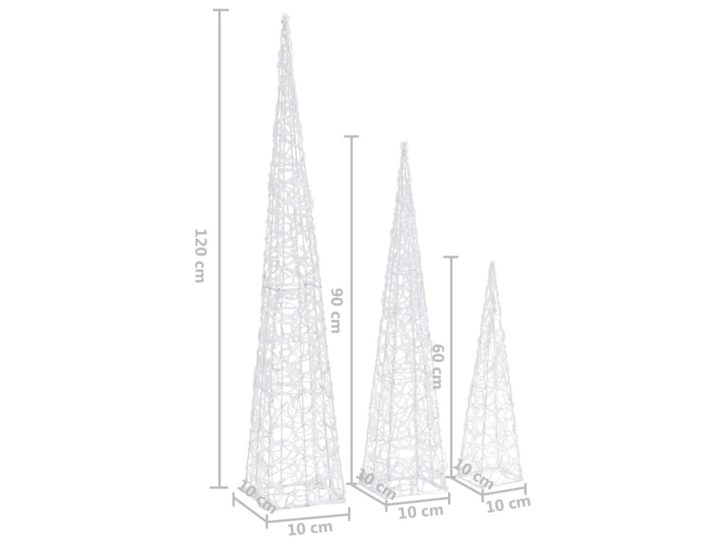 Táto sada obsahuje 3 svetelné kužele rôznej výšky. Telo dekoratívneho svetelného kužeľa je vyrobené z akrylu s luxusným vzhľadom a ľadovým leskom, ktorý rozžiari celý priestor v jeho okolí. Je vybavený energeticky úspornými LED diódami, a tak poskytuje jasné a silné osvetlenie. Ponúka 8 rôznych svetelných efektov: kombinovaný režim, svietenie vo vlnách, sekvenčný režim, režim pomalého rozsvecovania, blikanie, režim pomalého blednutia, mihotanie a stále svietenie. Tento krásny vianočný svetelný kužeľ je vodovzdorný, takže je vhodný do interiéru aj exteriéru.