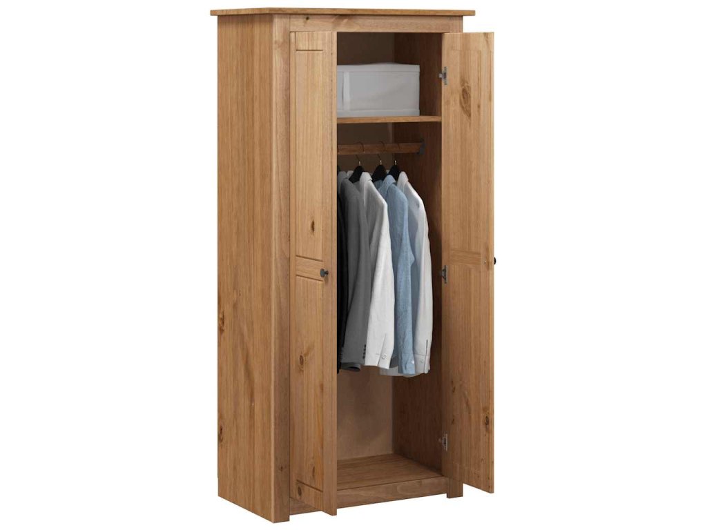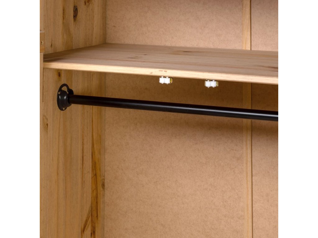 Šatník má upevnenú poličku na odkladanie a usporadúvanie obuvi, mikín, džínsov, klobúkov, kabeliek atď. Veľká priehradka je vybavená závesnou tyčou, ktorú môžete použiť na zavesenie kabátov, šiat atď. Šatník bol vyrobený z masívneho borovicového dreva, a preto je pevný a zaisťuje dlhodobé používanie.