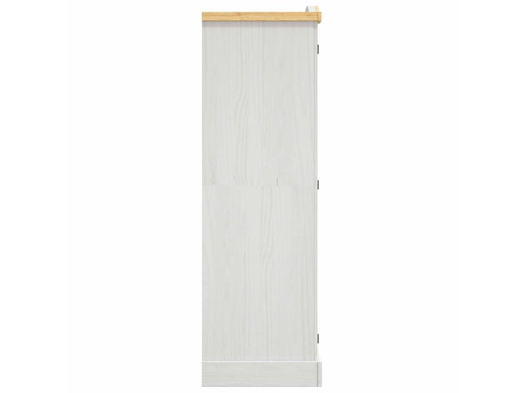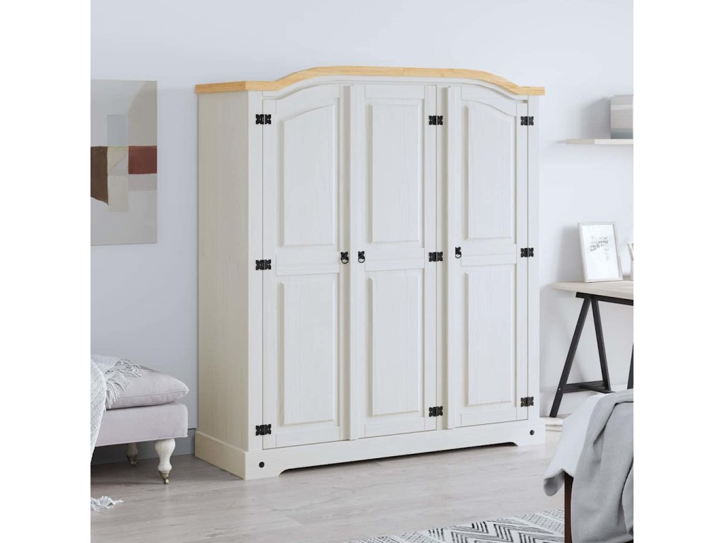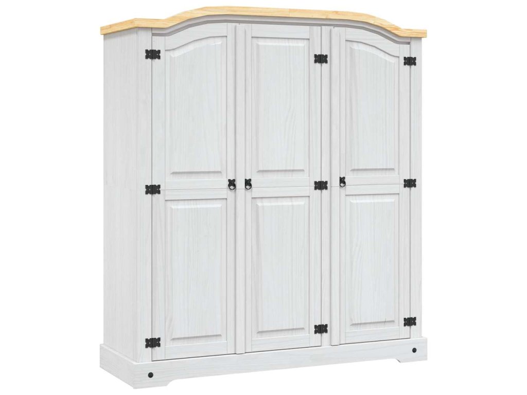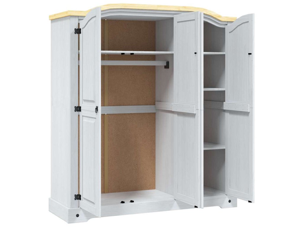 Skriňa má krásne klenutý dizajn a 3 dvere. Pevná a robustná skrinka je vyrobená z masívneho borovicového dreva. Veľká priehradka na ľavej strane obsahuje hornú poličku a závesnú tyč a poskytuje dostatok priestoru na uloženie oblečenia. Priestor na pravej strane má štyri poličky, ktoré sú ideálne na uloženie spodného prádla, ponožiek, atď.