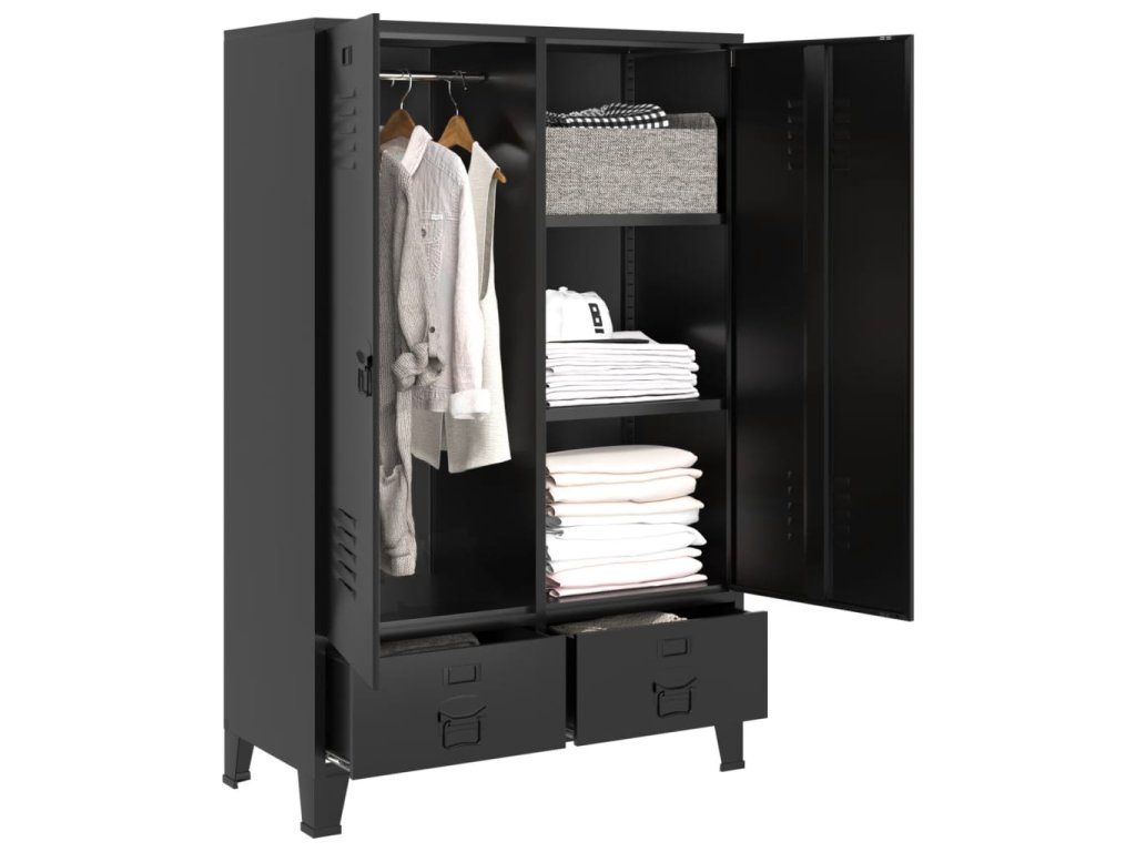 Táto skriňa je vyrobená z prvotriednej ocele, ktorá zaručuje trvácnosť, odolnosť a dlhú životnosť. Obsahuje 1 veľkú priehradku so závesnou tyčou, 3 menšie priehradky a 2 zásuvky, ktoré vám poskytujú dostatok priestoru pre vaše dlhšie oblečenie a iné poskladané veci alebo doplnky, ako sú svetre, rifle, klobúky, kabelky atď. Štítky vám pomôžu zorganizovať a usporiadať oblečenie elegantne podľa rôznych kategórií alebo ročných období.