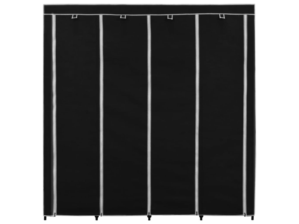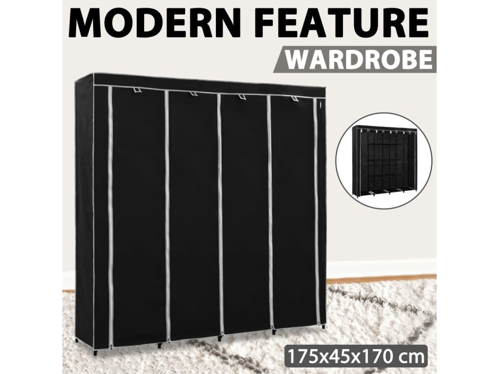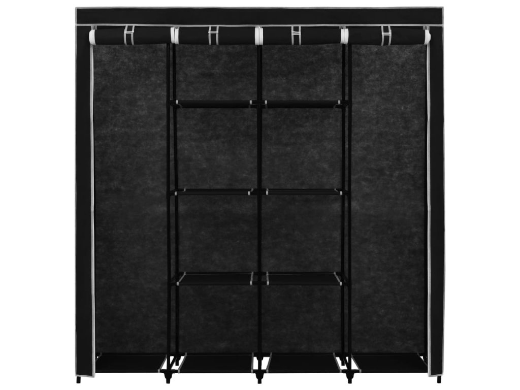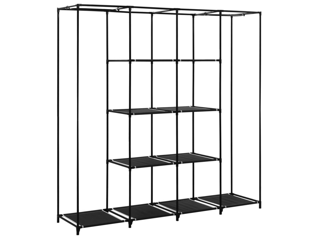 Vyznačuje sa pevným železným rámom, vďaka ktorému sa stojan na šaty ľahko premiestňuje a je mimoriadne odolný. Okrem toho má štyri priehradky, ktoré poskytujú dostatok priestoru na uloženie vašich tašiek, obuvi alebo malých predmetov, ktoré chcete mať na dosah. Textilný obal so zipsom ochráni vaše oblečenie pred špinou a prachom.