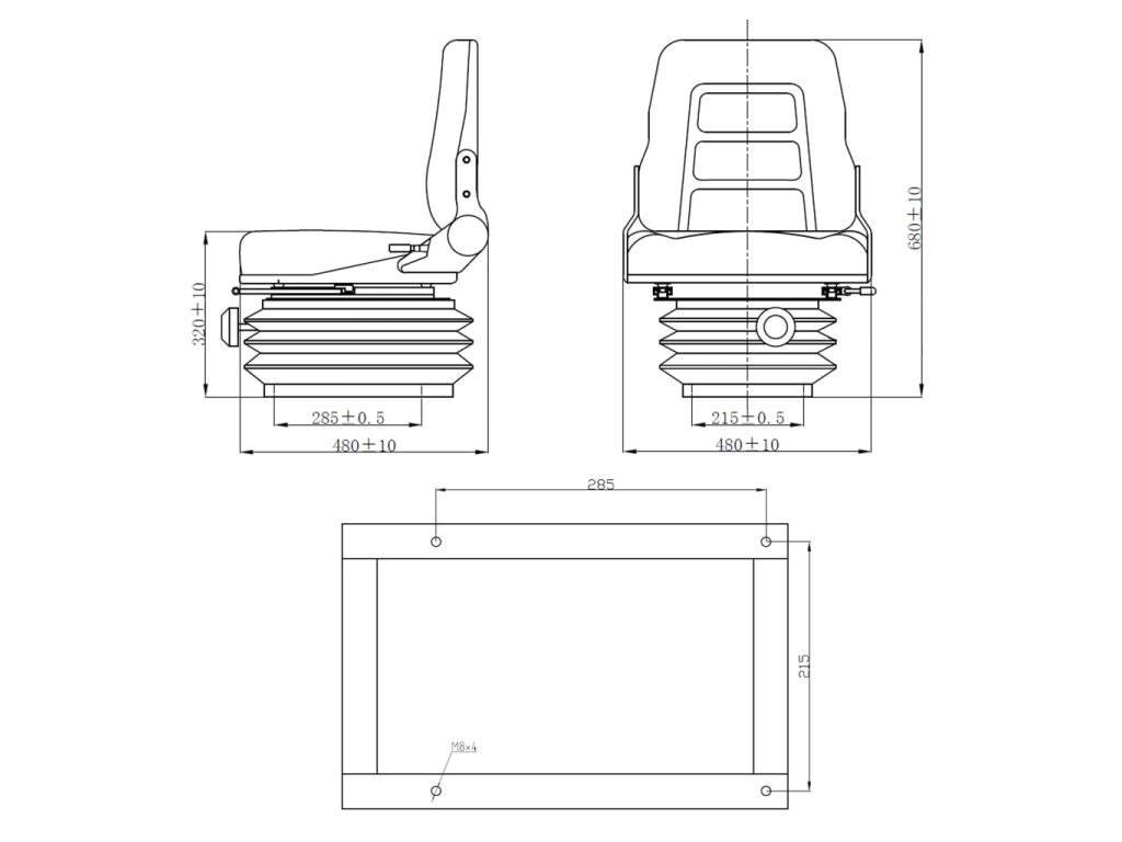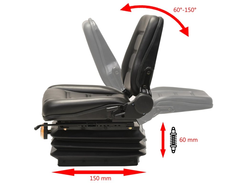 Sedadlo je vhodné pre používateľa s hmotnosťou od 50 do 130 kg pomocou nastavenia gombíka na spodnej strane. Obsahuje odpruženie, ktoré pomáha absorbovať šoky na nerovnom teréne a zabezpečuje čo najhladšiu jazdu na traktore alebo vysokozdvižnom vozíku. Toto sedadlo je vybavené aj posuvnými koľajnicami, ktoré umožňujú jednoduché a pohodlné posúvanie dopredu alebo dozadu v rozsahu 150 mm. Operadlo je nastaviteľné od 60° do 150°, takže vždy nájdete tú najpohodlnejšiu polohu. Montáž je jednoduchá.