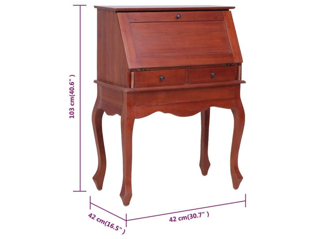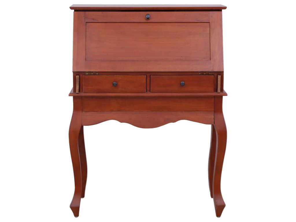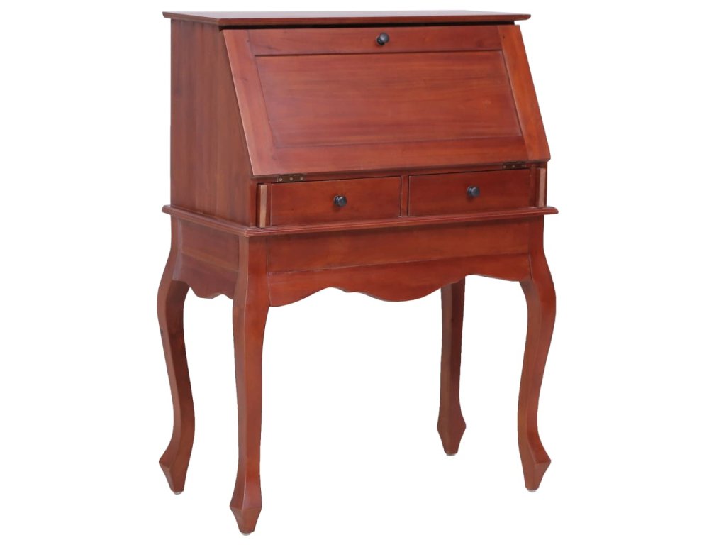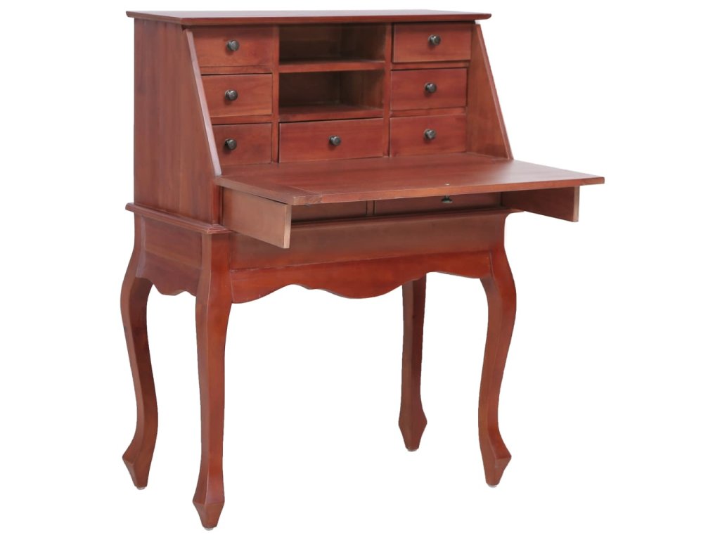 Sekretár je vybavený výklopnou doskou na písanie, ktorá vytvára veľký pracovný priestor s otvorenými priehradkami a zásuvkami vo vnútri, ktoré poskytujú dostatok úložného priestoru na úhľadné uloženie rôznych malých predmetov, ktoré potrebujete na dosah ruky. Stolík s poličkami je vyrobený z masívneho mahagónového dreva, tropického tvrdého dreva, ktoré vyniká svojou krásou, trvácnosťou a farbou. Vynikajúce remeselné spracovanie mu dodáva veľkolepý retro štýl. Každý krok procesu výroby sa vykonáva s najväčšou starostlivosťou, či už ide o leštenie, natieranie alebo lakovanie.