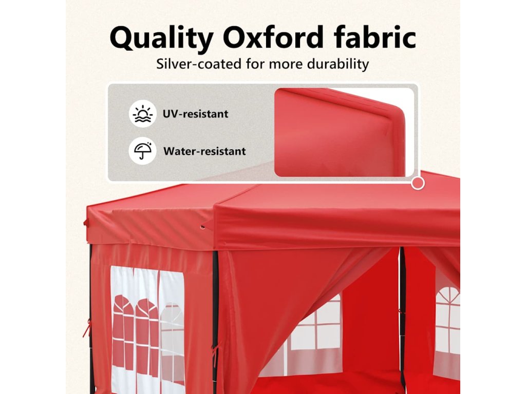 - Prémiový materiál strechy: Tento pavilón je vyrobený z oxfordskej tkaniny 210D so striebornou vrstvou a je odolný voči UV žiareniu a vode. Účinne blokuje škodlivé UV žiarenie a odolá aj vlhkosti a daždivému počasiu.