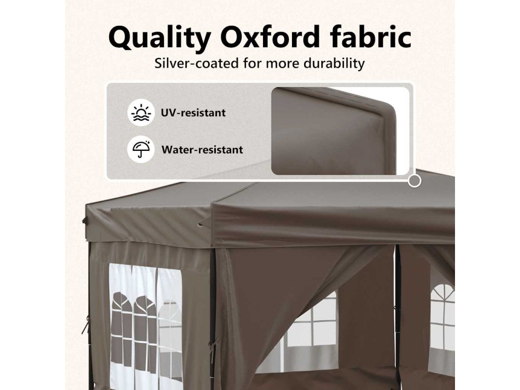 - Prémiový materiál strechy: Tento pavilón je vyrobený z oxfordskej tkaniny 210D so striebornou vrstvou a je odolný voči UV žiareniu a vode. Účinne blokuje škodlivé UV žiarenie a odolá aj vlhkosti a daždivému počasiu.