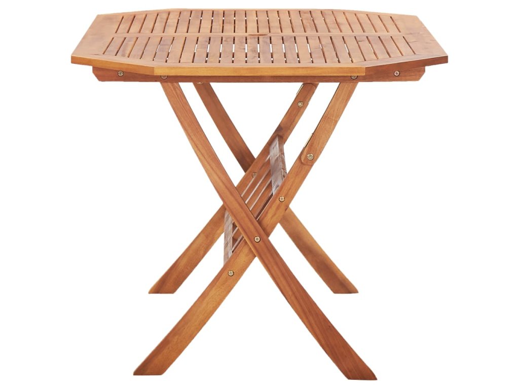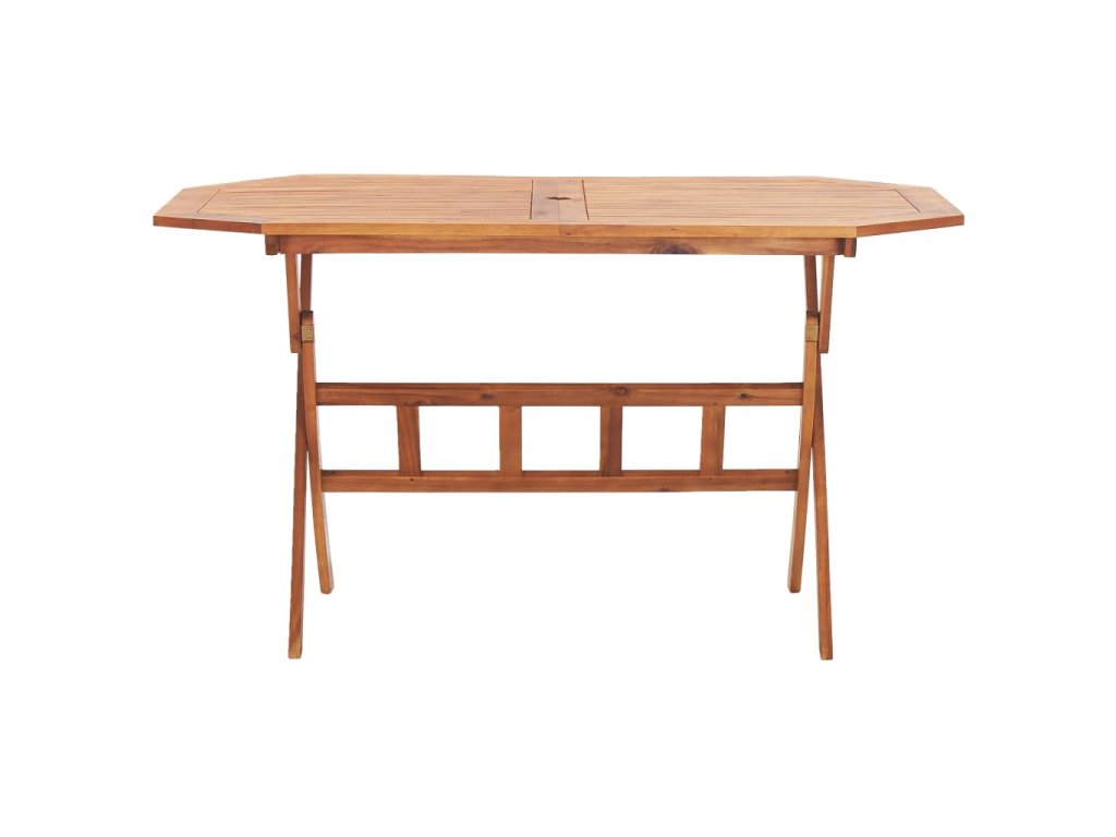 Vonkajší jedálenský stôl je vyrobený z akáciového masívu, tropického tvrdého dreva, ktoré je veľmi trvácne a odolné voči poveternostným vplyvom. V strede stola sa nachádza otvor na pevné uchytenie slnečníka. Bistro stolík sa dá jednoducho poskladať, aby nezaberal veľa miesta, keď sa nepoužíva. Jedálenský stôl je potrebné zmontovať.