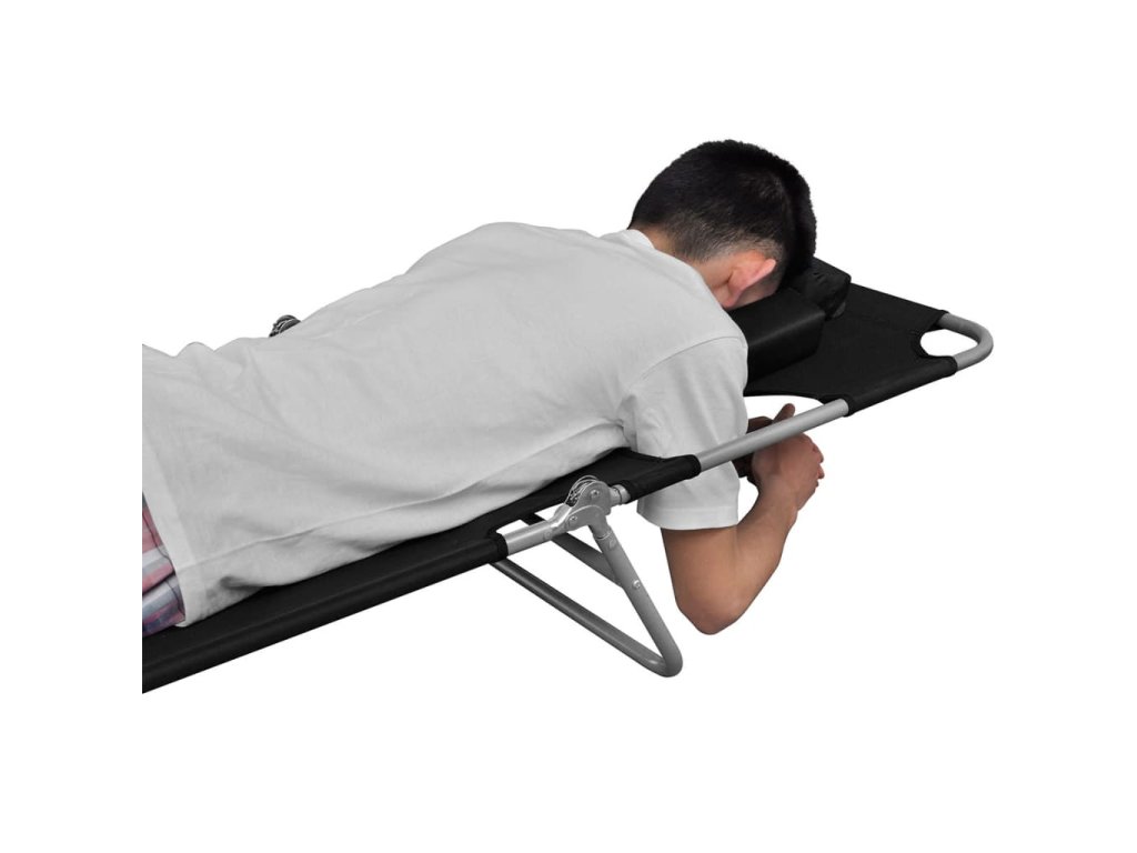 Vďaka oceľovému rámu s práškovou povrchovou úpravou je tento výrobok dostatočne stabilný a trvácny. Keď ho nepoužívate, stači ho len poskladať, aby nezaberalo veľa miesta pri skladovaní. Ležadlo je vyrobené z vysokokvalitných materiálov a dodáva sa spolu s podložkami, vďaka čomu je veľmi pohodlné.