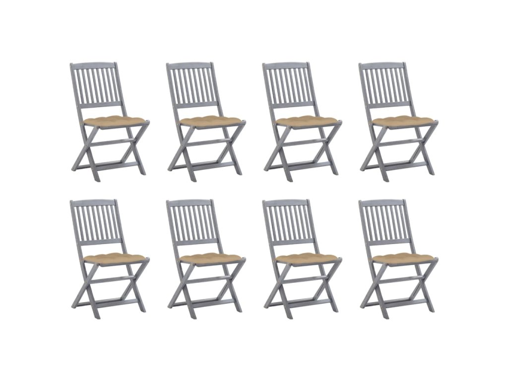 Tieto jedálenské stoličky sú vyrobené z masívneho akáciového dreva, tropického tvrdého dreva, ktoré je odolné voči poveternostným vplyvom a trvácne pre dlhé roky používania. Akáciový masív má dostatočnú silu, aby uniesol zaťaženie, ale odolá aj dlhodobému používaniu. Sivý premývaný povrch sa ľahko čistí vlhkou handričkou. Keď sa stoličky nepoužívajú, dajú sa sklopiť, aby sa ušetrilo miesto. Pribalený vankúš poskytuje vysoké pohodlie pri oddychu alebo stolovaní. Každý vankúš má dve sady šnúrok, pomocou ktorých ho pevne pripevníte k stoličke.