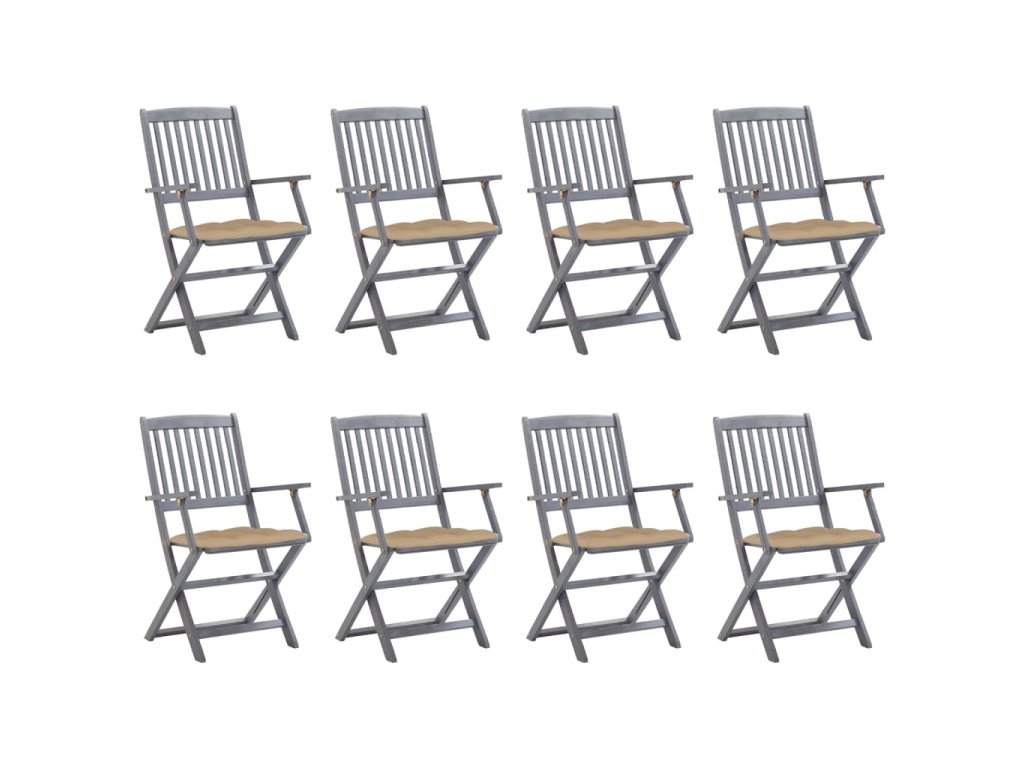 Tieto jedálenské stoličky sú vyrobené z masívneho akáciového dreva, tropického tvrdého dreva, ktoré je odolné voči poveternostným vplyvom a trvácne pre dlhé roky používania. Akáciový masív má dostatočnú silu, aby uniesol zaťaženie, ale odolá aj dlhodobému používaniu. Sivý premývaný povrch sa ľahko čistí vlhkou handričkou. Keď sa stoličky nepoužívajú, dajú sa sklopiť, aby sa ušetrilo miesto. Pribalený vankúš poskytuje vysoké pohodlie pri oddychu alebo stolovaní. Každý vankúš má dve sady šnúrok, pomocou ktorých ho pevne pripevníte k stoličke.