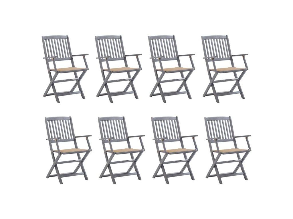 Tieto jedálenské stoličky sú vyrobené z masívneho akáciového dreva, tropického tvrdého dreva, ktoré je odolné voči poveternostným vplyvom a trvácne pre dlhé roky používania. Akáciový masív má dostatočnú silu, aby uniesol zaťaženie, ale odolá aj dlhodobému používaniu. Sivý premývaný povrch sa ľahko čistí vlhkou handričkou. Keď sa stoličky nepoužívajú, dajú sa sklopiť, aby sa ušetrilo miesto. Pribalený vankúš poskytuje vysoké pohodlie pri oddychu alebo stolovaní. Každý vankúš má dve sady šnúrok, pomocou ktorých ho pevne pripevníte k stoličke.