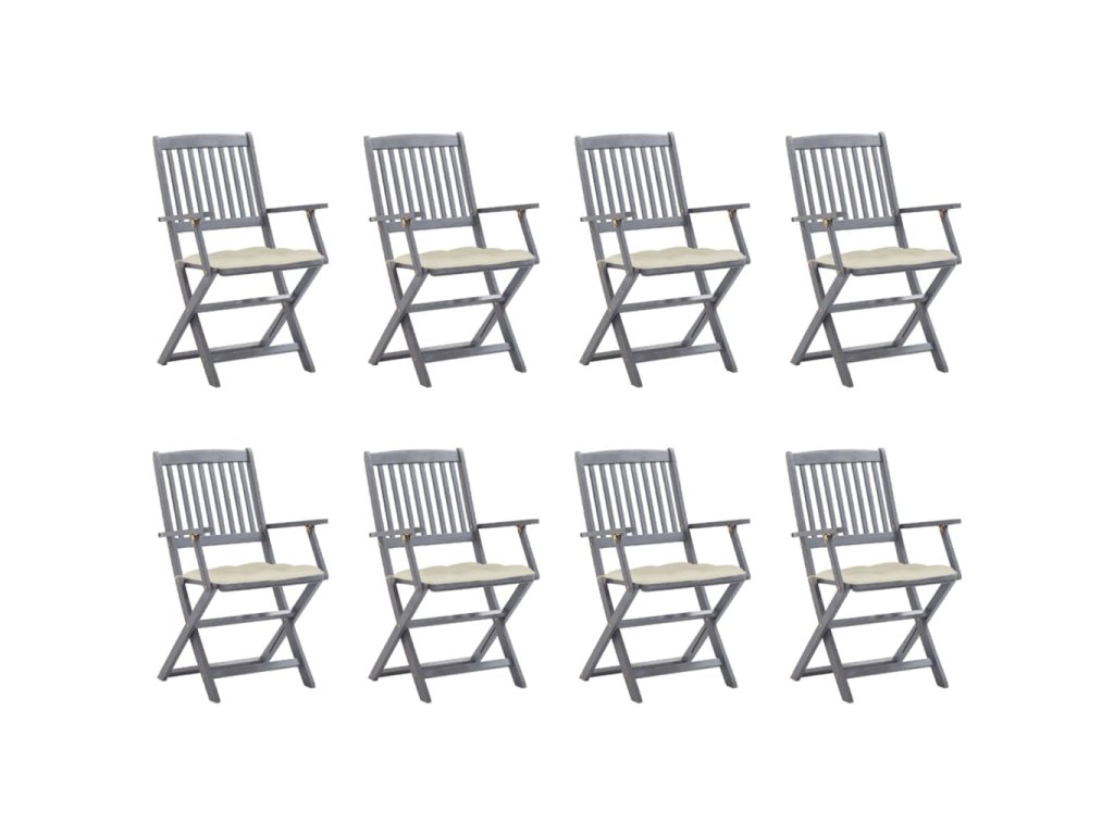 Tieto jedálenské stoličky sú vyrobené z masívneho akáciového dreva, tropického tvrdého dreva, ktoré je odolné voči poveternostným vplyvom a trvácne pre dlhé roky používania. Akáciový masív má dostatočnú silu, aby uniesol zaťaženie, ale odolá aj dlhodobému používaniu. Sivý premývaný povrch sa ľahko čistí vlhkou handričkou. Keď sa stoličky nepoužívajú, dajú sa sklopiť, aby sa ušetrilo miesto. Pribalený vankúš poskytuje vysoké pohodlie pri oddychu alebo stolovaní. Každý vankúš má dve sady šnúrok, pomocou ktorých ho pevne pripevníte k stoličke.
