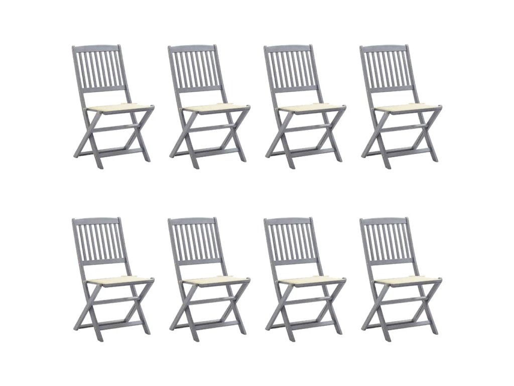 Tieto jedálenské stoličky sú vyrobené z masívneho akáciového dreva, tropického tvrdého dreva, ktoré je odolné voči poveternostným vplyvom a trvácne pre dlhé roky používania. Akáciový masív má dostatočnú silu, aby uniesol zaťaženie, ale odolá aj dlhodobému používaniu. Sivý premývaný povrch sa ľahko čistí vlhkou handričkou. Keď sa stoličky nepoužívajú, dajú sa sklopiť, aby sa ušetrilo miesto. Pribalený vankúš poskytuje vysoké pohodlie pri oddychu alebo stolovaní. Každý vankúš má dve sady šnúrok, pomocou ktorých ho pevne pripevníte k stoličke.