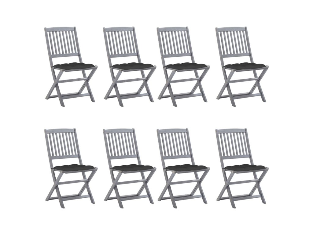 Tieto jedálenské stoličky sú vyrobené z masívneho akáciového dreva, tropického tvrdého dreva, ktoré je odolné voči poveternostným vplyvom a trvácne pre dlhé roky používania. Akáciový masív má dostatočnú silu, aby uniesol zaťaženie, ale odolá aj dlhodobému používaniu. Sivý premývaný povrch sa ľahko čistí vlhkou handričkou. Keď sa stoličky nepoužívajú, dajú sa sklopiť, aby sa ušetrilo miesto. Pribalený vankúš poskytuje vysoké pohodlie pri oddychu alebo stolovaní. Každý vankúš má dve sady šnúrok, pomocou ktorých ho pevne pripevníte k stoličke.