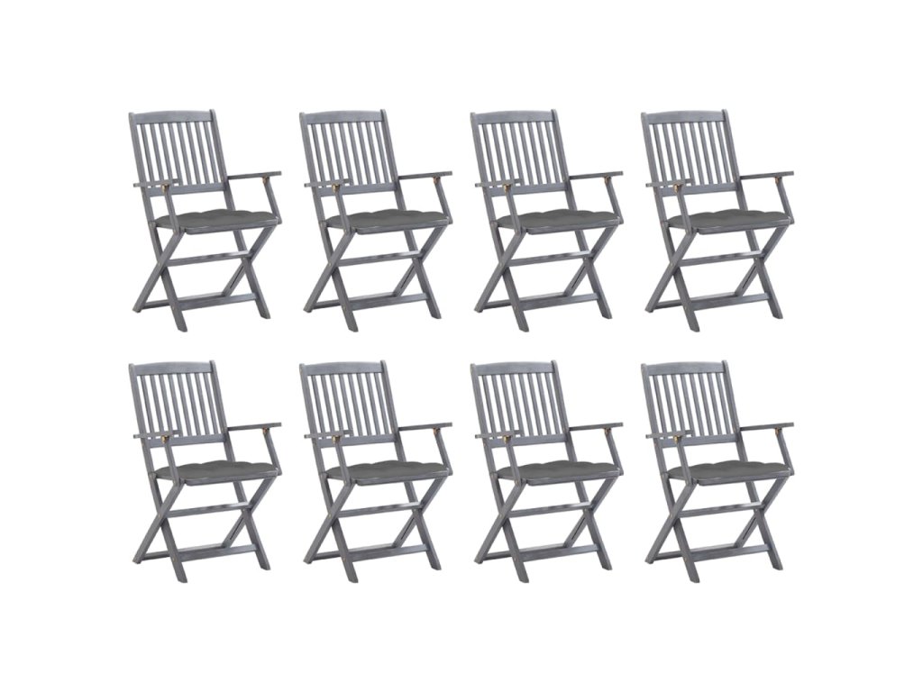 Tieto jedálenské stoličky sú vyrobené z masívneho akáciového dreva, tropického tvrdého dreva, ktoré je odolné voči poveternostným vplyvom a trvácne pre dlhé roky používania. Akáciový masív má dostatočnú silu, aby uniesol zaťaženie, ale odolá aj dlhodobému používaniu. Sivý premývaný povrch sa ľahko čistí vlhkou handričkou. Keď sa stoličky nepoužívajú, dajú sa sklopiť, aby sa ušetrilo miesto. Pribalený vankúš poskytuje vysoké pohodlie pri oddychu alebo stolovaní. Každý vankúš má dve sady šnúrok, pomocou ktorých ho pevne pripevníte k stoličke.