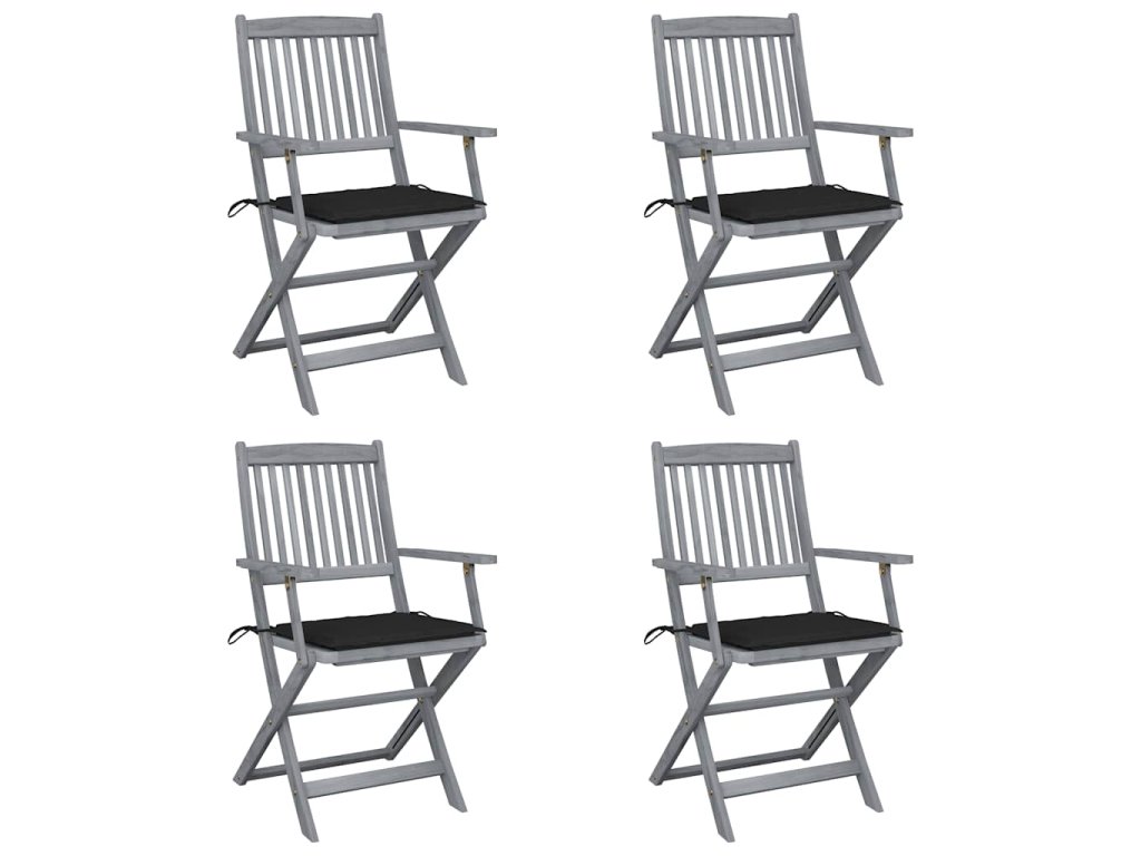 Tieto jedálenské stoličky sú vyrobené z masívneho akáciového dreva, tropického tvrdého dreva, ktoré je odolné voči poveternostným vplyvom a trvácne pre dlhé roky používania. Akáciový masív má dostatočnú silu, aby uniesol zaťaženie, ale odolá aj dlhodobému používaniu. Sivý premývaný povrch sa ľahko čistí vlhkou handričkou. Keď sa stoličky nepoužívajú, dajú sa sklopiť, aby sa ušetrilo miesto. Pribalený vankúš poskytuje vysoké pohodlie pri oddychu alebo stolovaní. Každý vankúš má dve sady šnúrok, pomocou ktorých ho pevne pripevníte k stoličke.