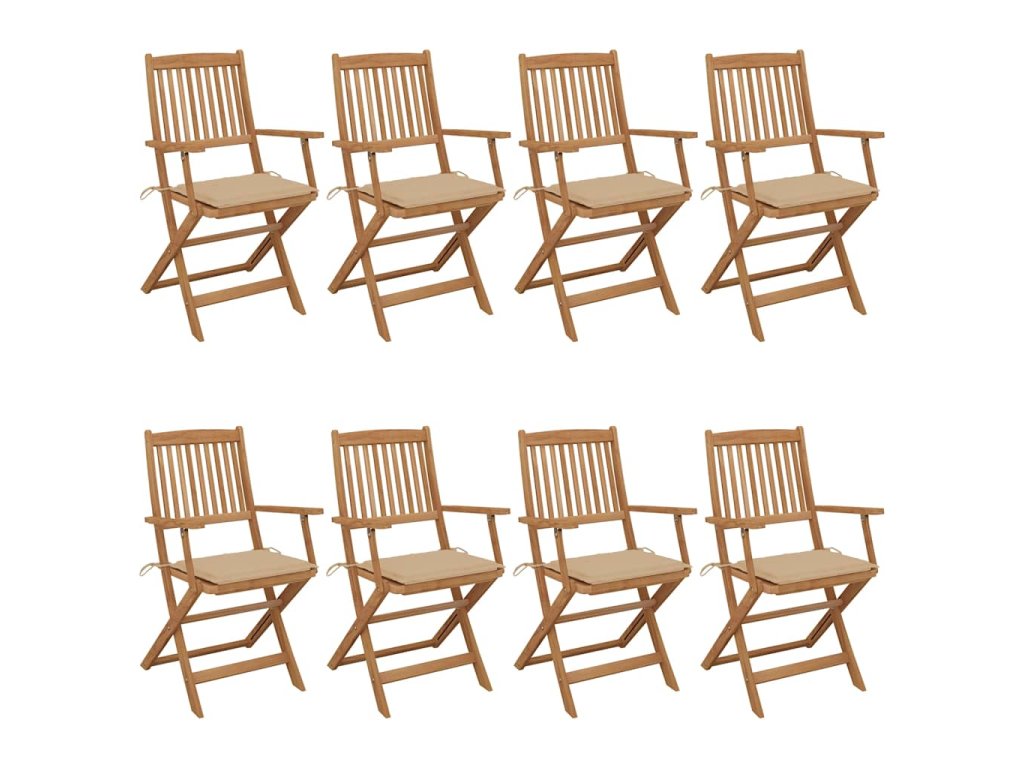 Tieto skladacie stoličky z masívneho akáciového dreva s podložkami poskytujú ideálne miesto na odpočinok a užívanie si slnečných lúčov na záhrade alebo terase.