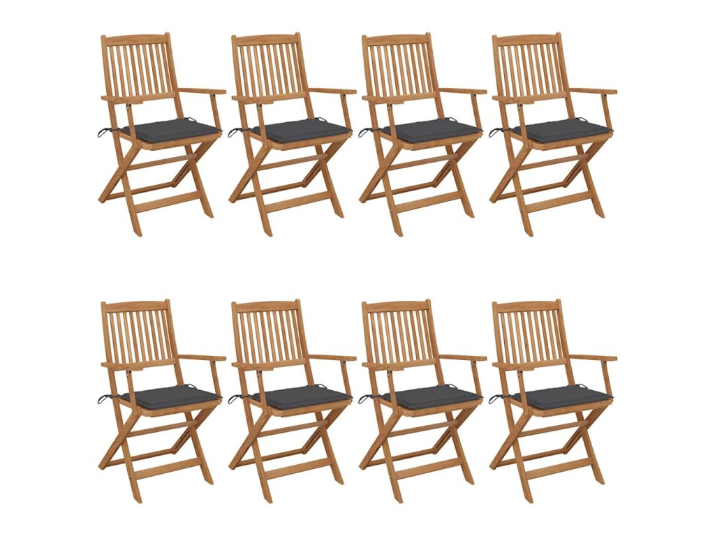 Tieto skladacie stoličky z masívneho akáciového dreva s podložkami poskytujú ideálne miesto na odpočinok a užívanie si slnečných lúčov na záhrade alebo terase.