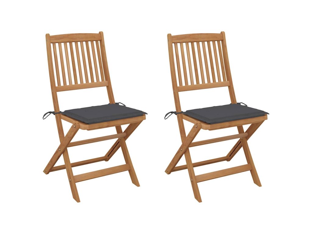 Tieto skladacie stoličky z masívneho akáciového dreva s podložkami poskytujú ideálne miesto na odpočinok a užívanie si slnečných lúčov na záhrade alebo terase.