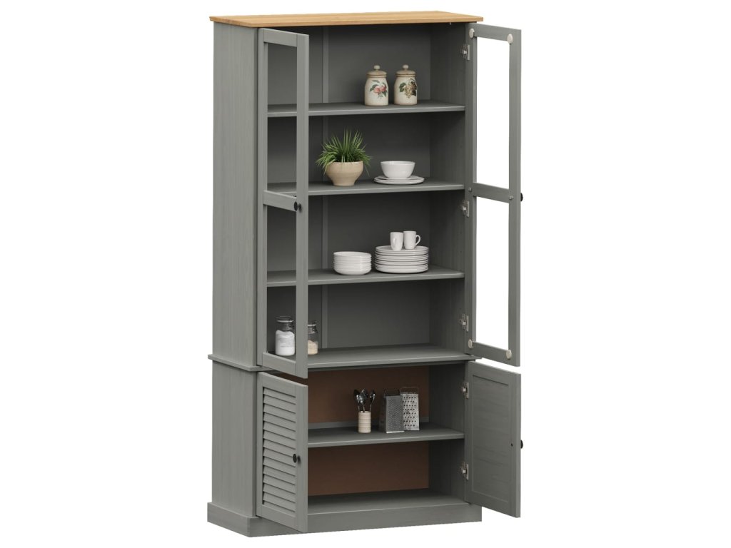 - Dostatok úložného priestoru: Táto skrinka so sklenenými dvierkami, vybavená policami, poskytuje dostatok priestoru na uchovanie vašej zbierky šálok, riadu a malých dekoratívnych predmetov.