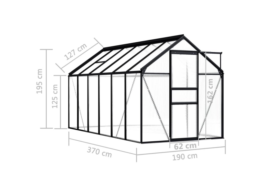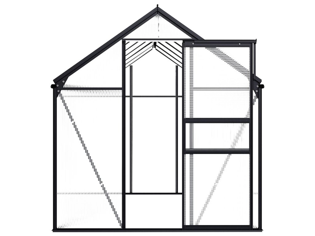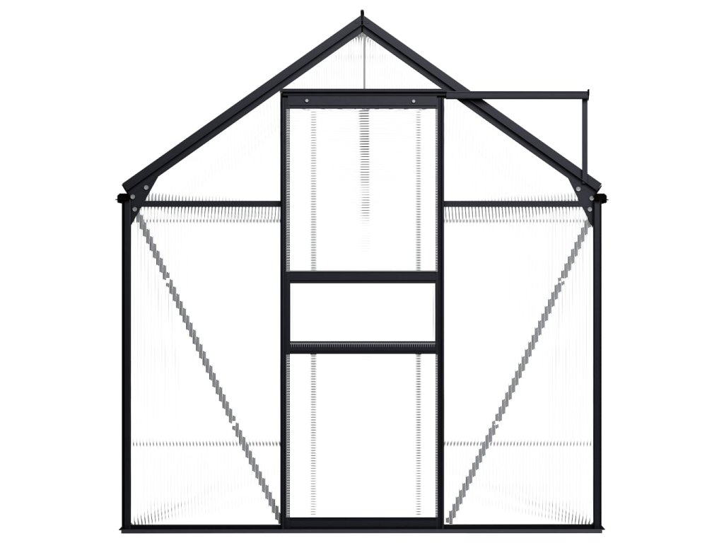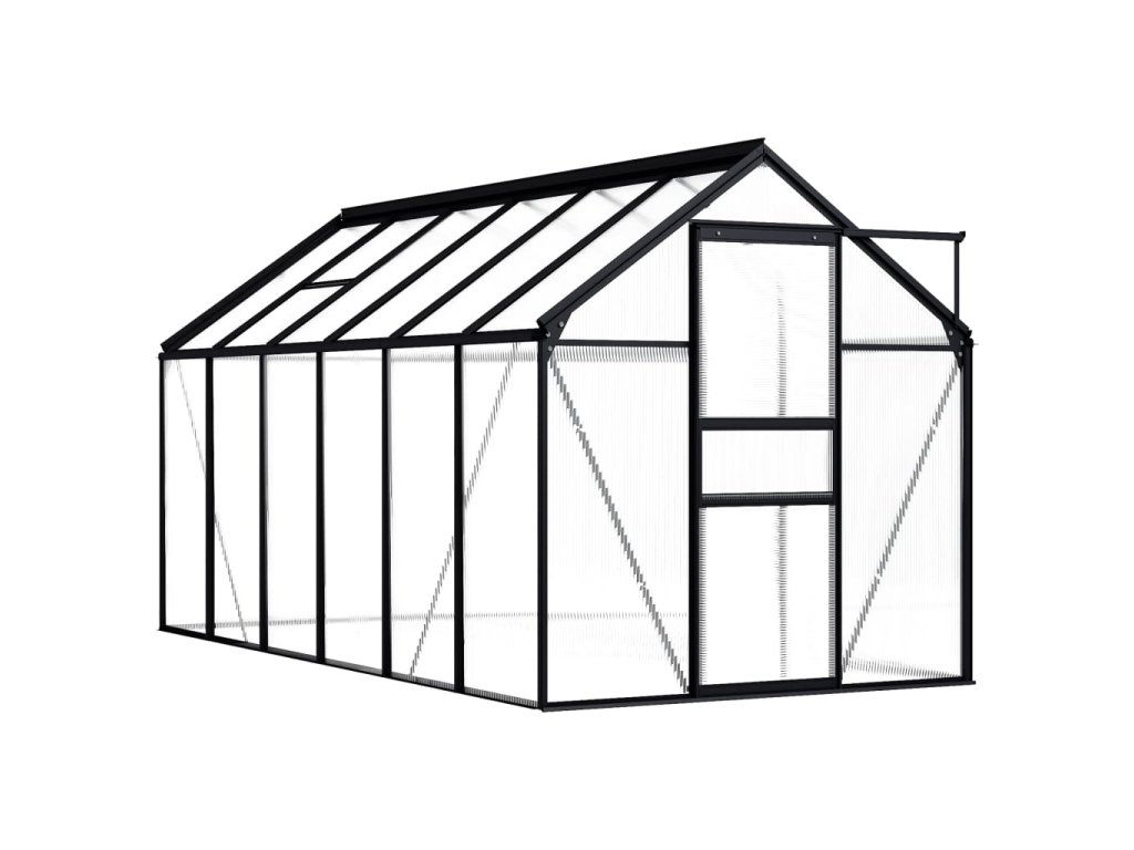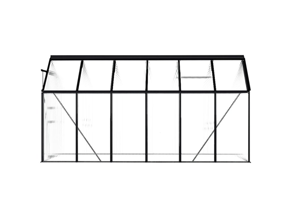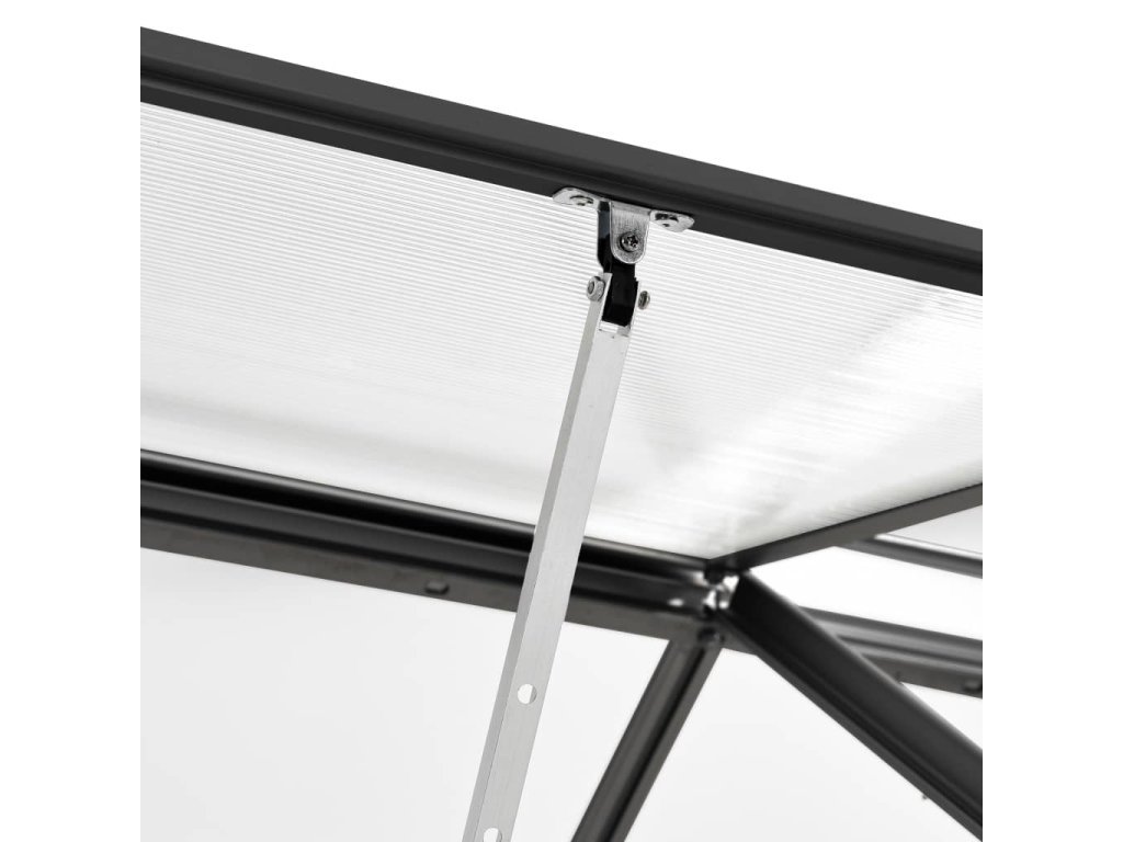 Tento pevný skleník je odolný voči UV žiareniu a tepelne izolovaný. Skleník je vyrobený z polykarbonátových dosiek a má robustnú a bezúdržbovú hliníkovú konštrukciu pre vyššiu stabilitu. Žľabový systém zabezpečuje odtok vody a strešné otvory optimálne vetranie v horúcich dňoch. Strešné panely sú upevnené kovovými svorkami, ktoré zaisťujú ich trvácnosť a dlhodobé používanie. Montáž nášho skleníka je jednoduchá.