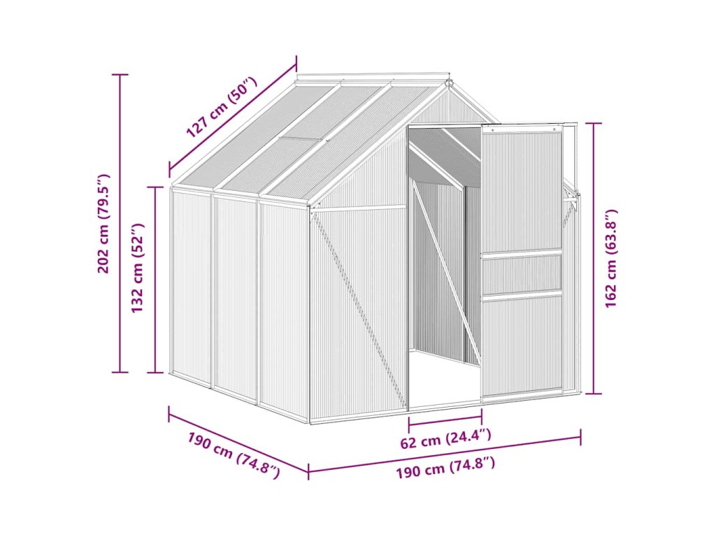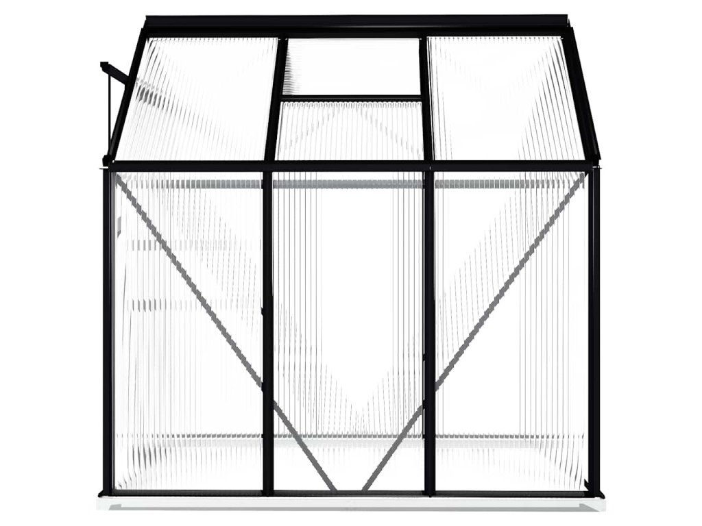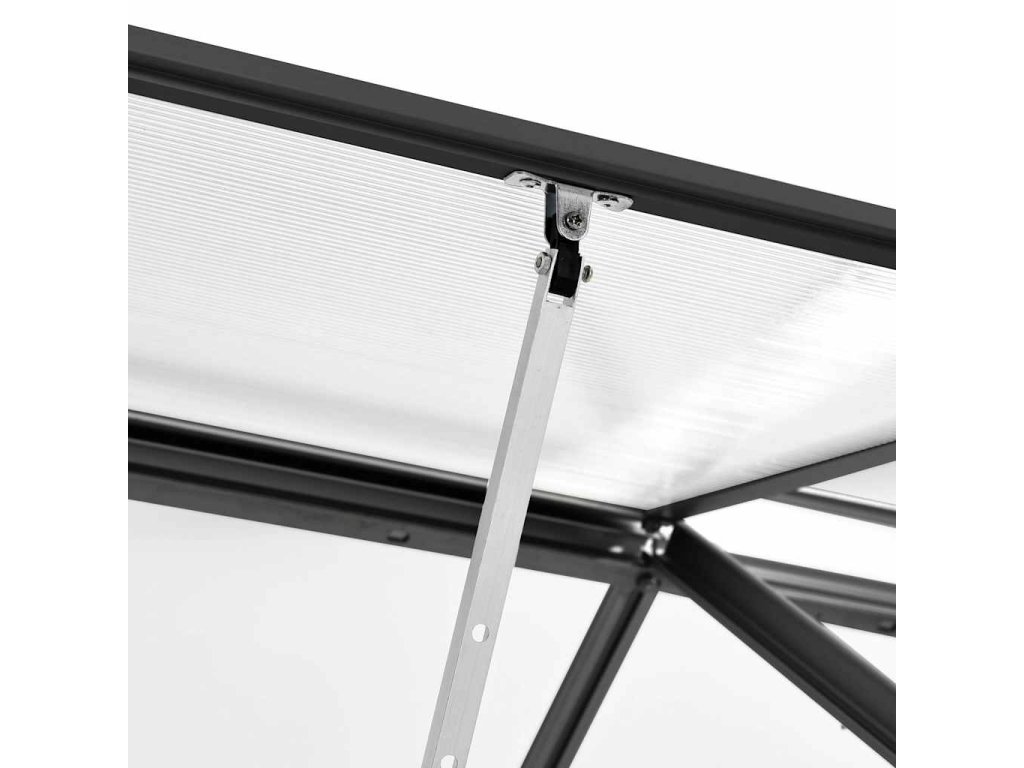 Tento pevný skleník je odolný voči UV žiareniu a tepelne izolovaný. Skleník je vyrobený z polykarbonátových dosiek a má robustnú a bezúdržbovú hliníkovú konštrukciu pre vyššiu stabilitu (vyrobenú zo 4 pevných profilov). Žľabový systém zabezpečuje odtok vody a strešné otvory optimálne vetranie v horúcich dňoch. Strešné panely sú upevnené kovovými svorkami, ktoré zaisťujú ich trvácnosť a dlhodobé používanie. Montáž nášho skleníka je jednoduchá.