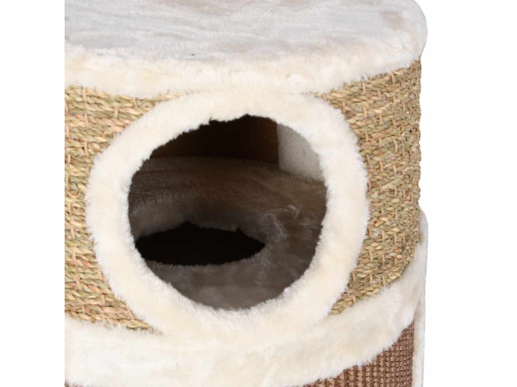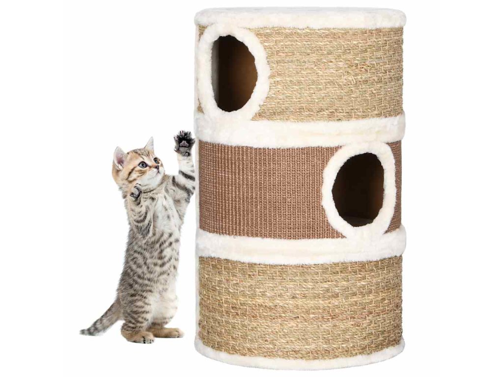 Priestranný sud je vhodný najmä pre veľké plemená mačiek. Poskytuje im dostatočný priestor, aby sa mohli schovať, posedieť si, šplhať sa, ale aj odpočívať. Sud obsahuje 3 veľké otvory pre ľahký prístup na vyššiu úroveň. Pokrytie morskou trávou umožňuje vašim mačkám zaostriť si pazúriky a ochráni váš nábytok pred poškodením. Mäkký plyš z vnútornej strany poskytuje vašim chlpatým priateľom to najvyššie pohodlie.