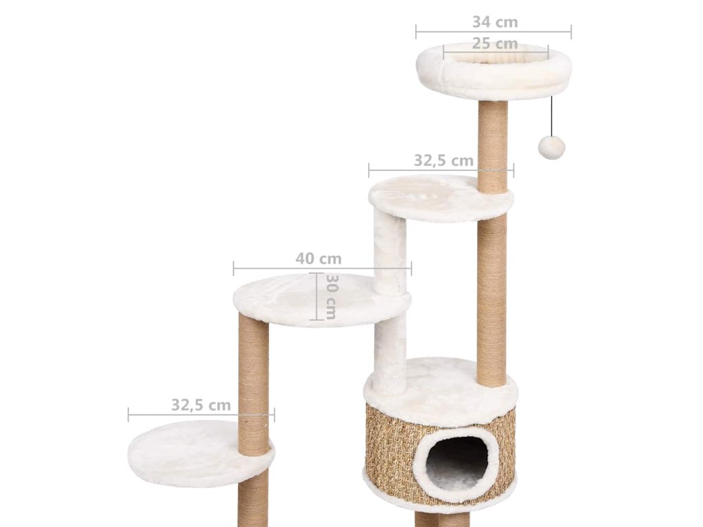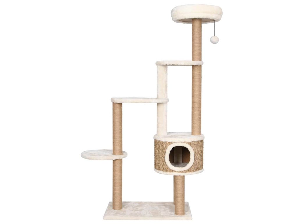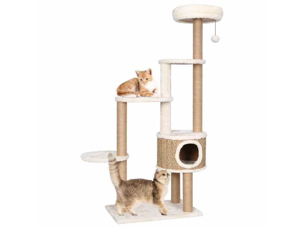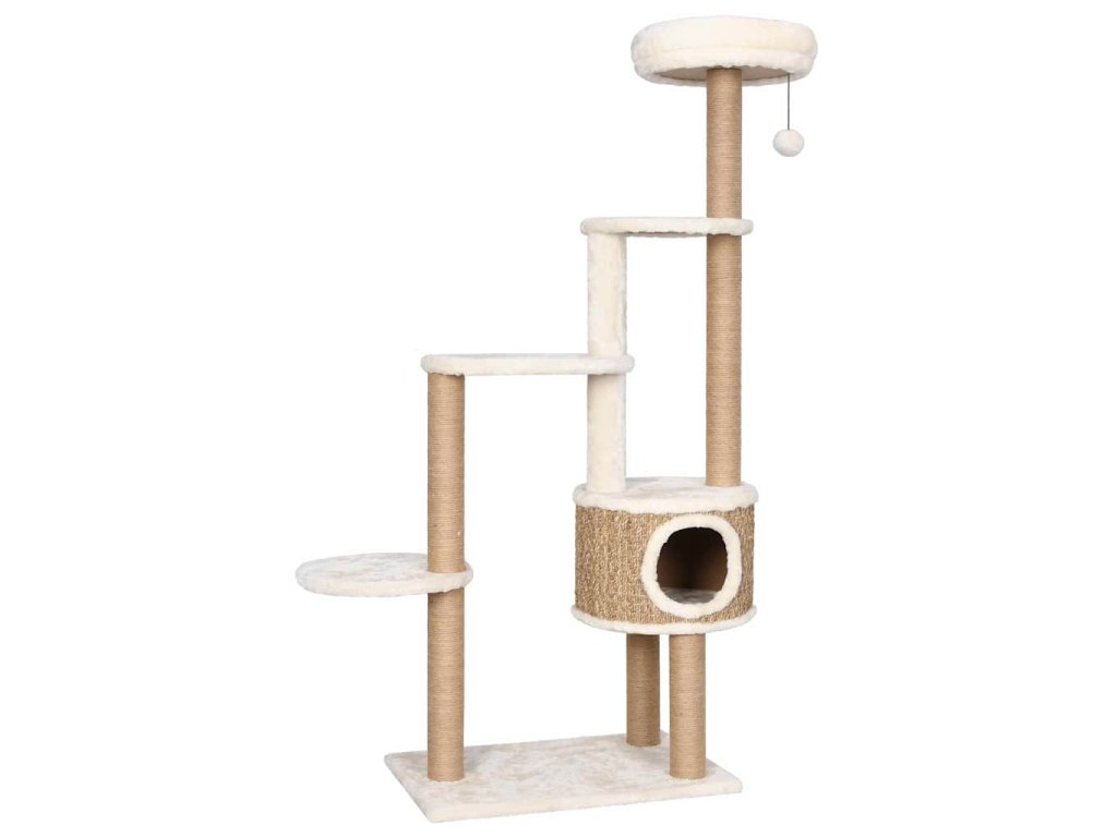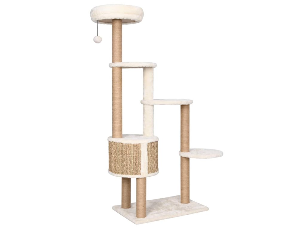Vysoký mačací strom obsahuje niekoľko platforiem a domček, takže vaše mačky na ňom môžu podľa potreby škriabať, skákať, liezť, ale aj odpočívať. Stĺpiky na škriabanie sú obalené morskou trávou, čo vašim mačacím kamarátom mimoriadne dobre naostrí pazúriky. Horná platforma je navrhnutá s luxusným vankúšom, ktorá mačkám poskytuje útulné miesto na odpočinok alebo spánok. Okrem toho obsahuje aj závesnú loptičku pre extra zábavu.