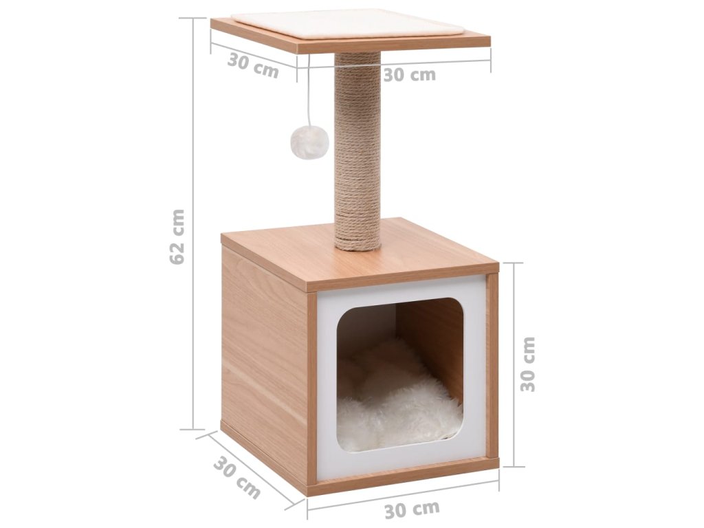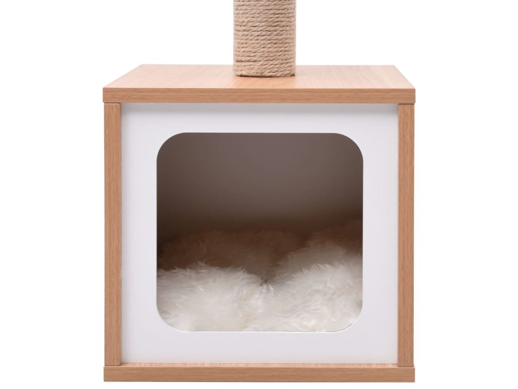 Tento krásny domček predstavuje ideálne miesto, kde sa môže mačka dosýtosti zabaviť škrabaním či lezením alebo sa ukryť do domčeka, pozorovať okolie a nerušene odpočívať. Určite sa bude hodiť do akéhokoľvek interiéru.