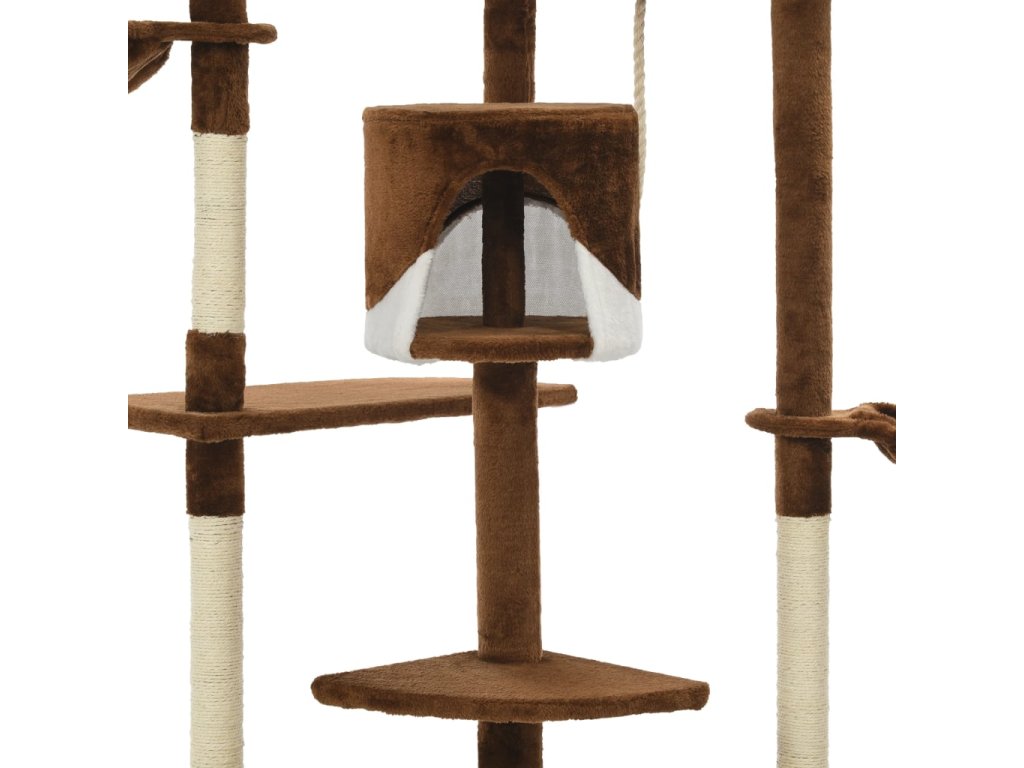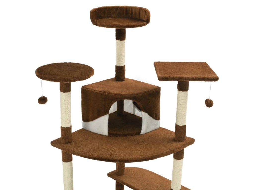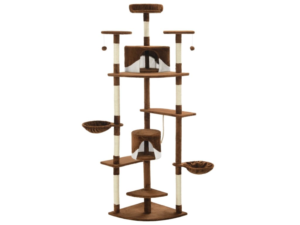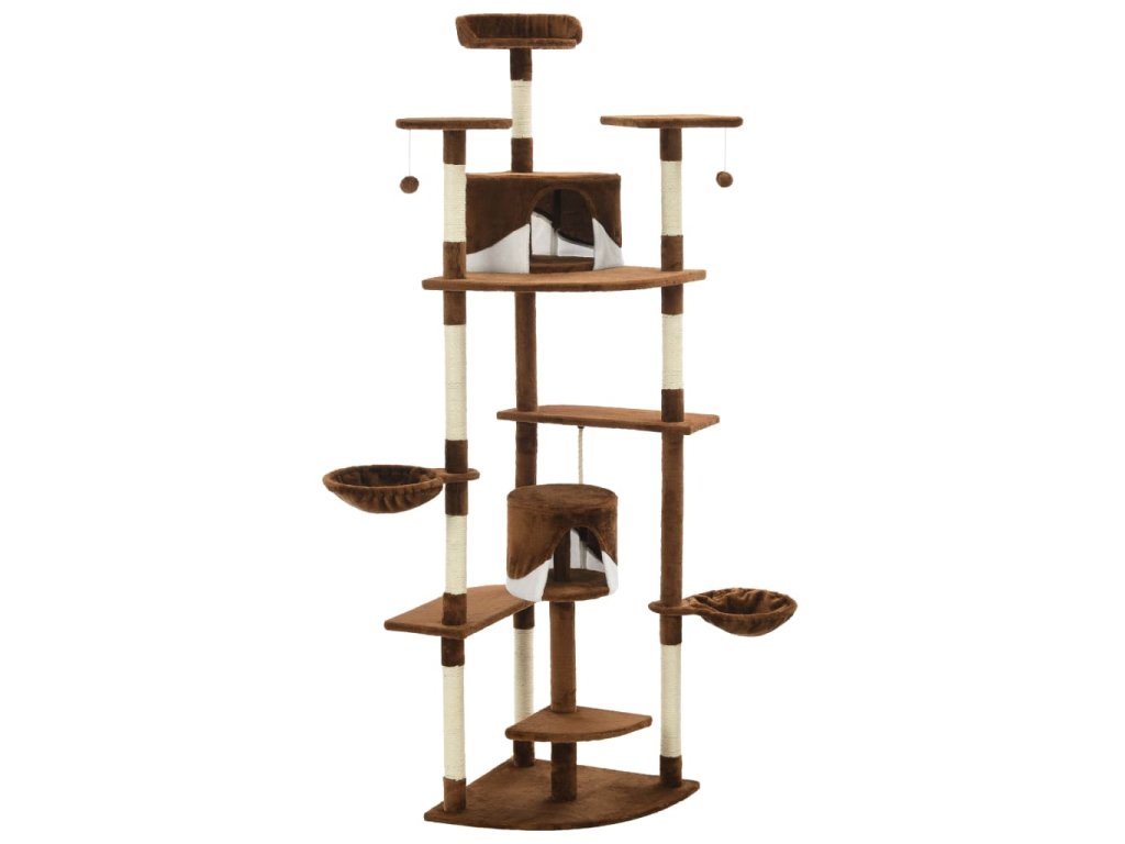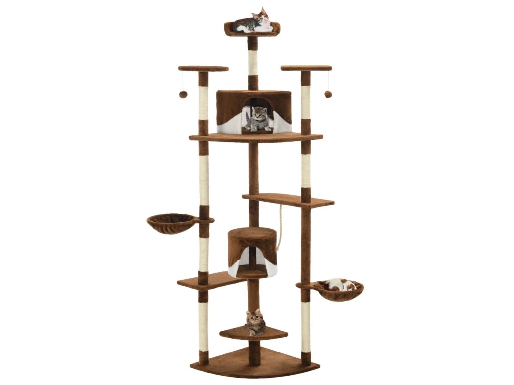Vaši mačací priatelia si môžu ostriť svoje pazúriky na škrabacích stĺpikoch obalených sisalovým lanom, ktoré poskytuje zdravý spôsob škriabania. Na tejto mačacej veži na hranie si taktiež budú vychutnávať hru na prenasledovanie počas skákania hore a dole. V hornej časti mačacieho stromu sú zavesené dve hračky, ktoré zaujmú vaše zvedavé mačky. Keď sa vaši malí priatelia dohrajú, môžu oddychovať na horných plošinách, odkiaľ majú lepší výhľad. Alebo sa môžu schovať do útulných domčekov a pospať si alebo si odpočinúť v pohodlných košíkoch.