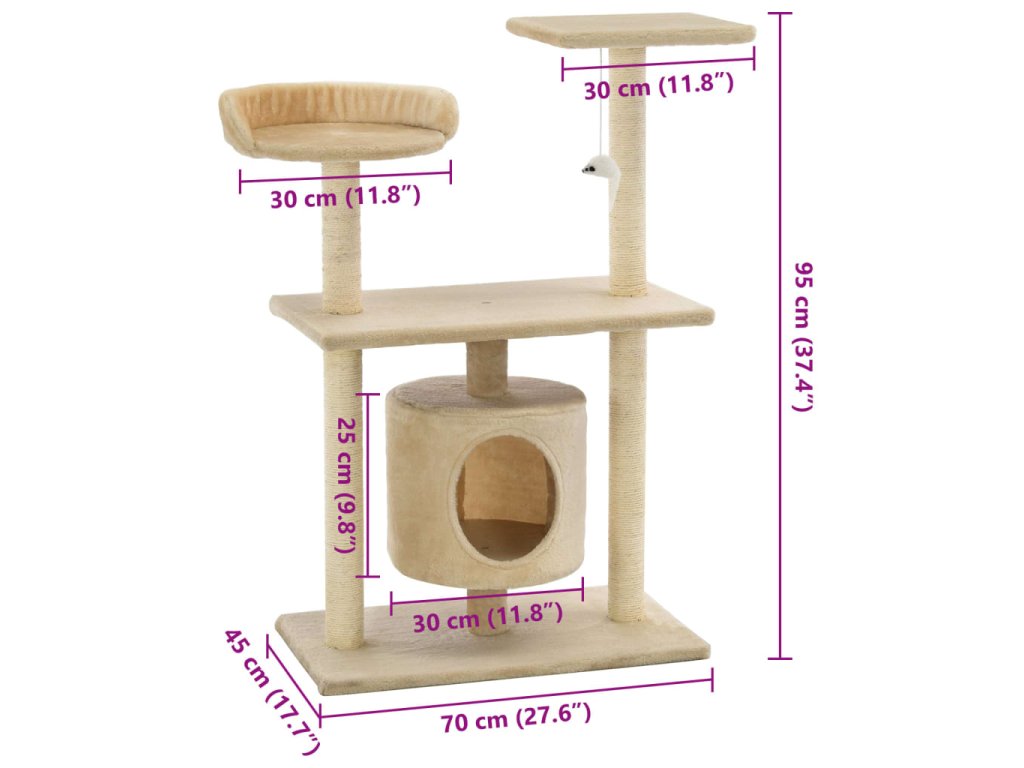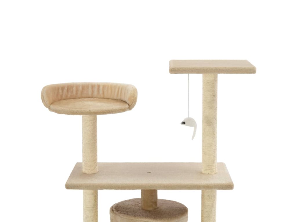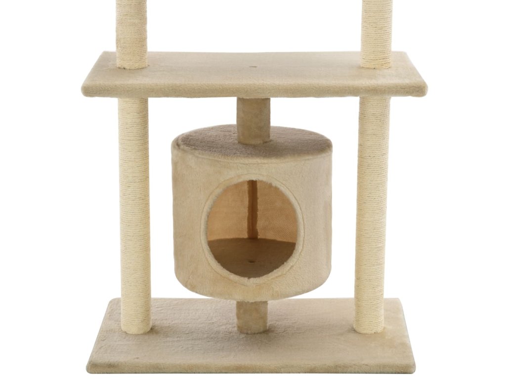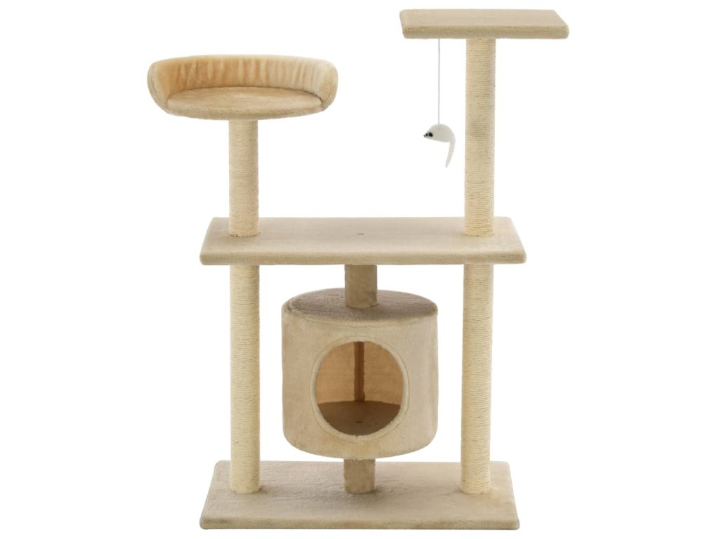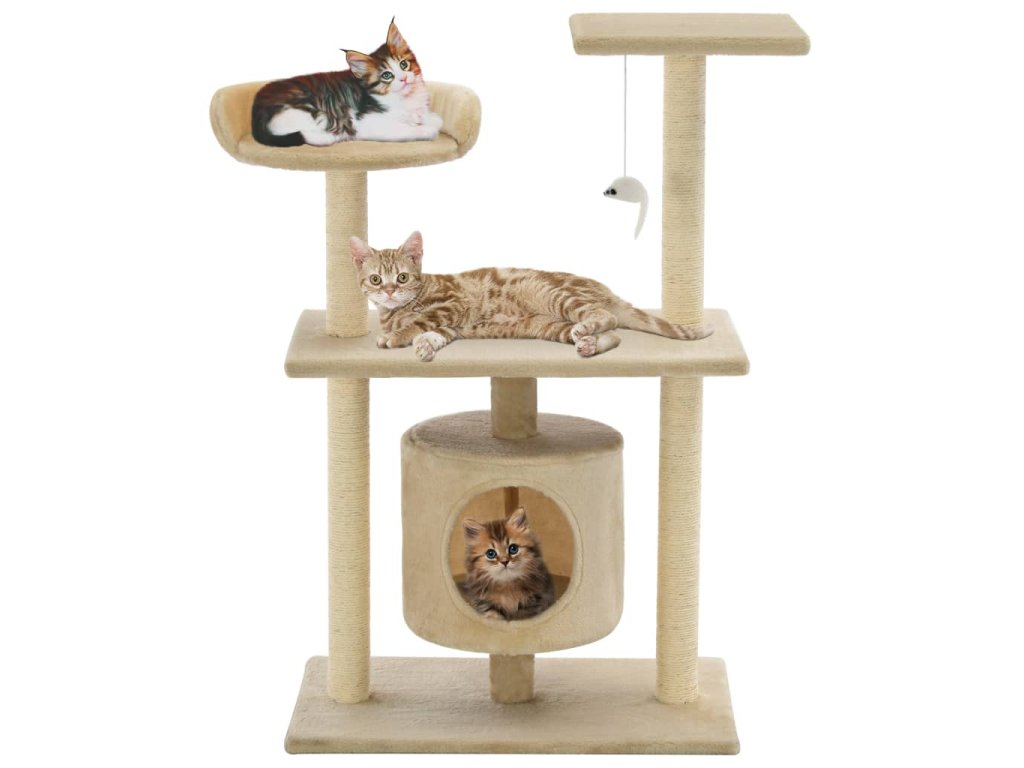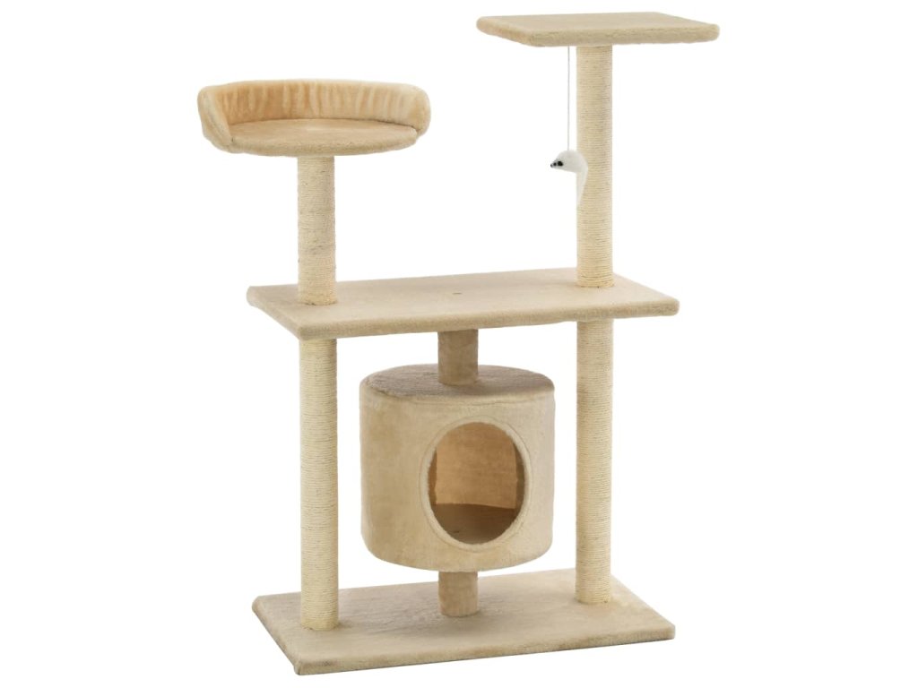 Vaši mačací priatelia si môžu ostriť pazúriky na škrabacích stĺpikoch obalených sisalovým lanom, ktoré im poskytnú zdravý spôsob ako si tento svoj inštinkt trénovať. Budú sa veselo naháňať a skákať hore dole po strome. V hornej časti mačacieho stromu je zavesená hračka, ktorá mačky určite zaujme. Keď sa vašim malým kamarátom prestane chcieť hrať, zaiste si radi oddýchnu na plošinách v hornej časti, odkiaľ majú lepší výhľad. Alebo sa môžu schovať do útulného domčeka a pospať si.