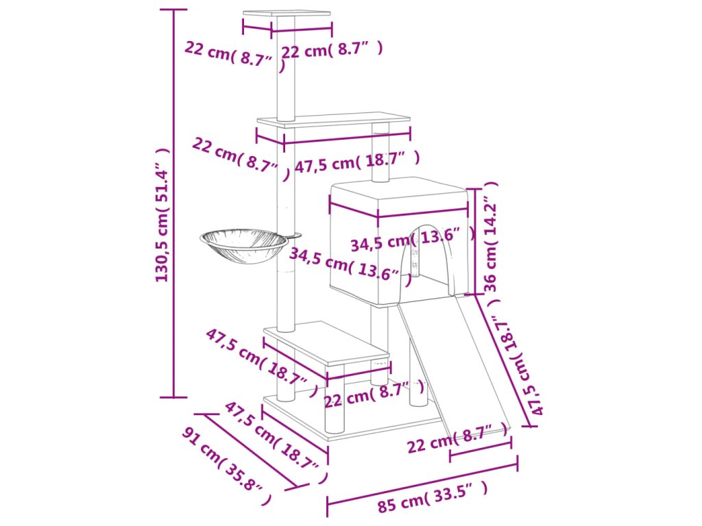 - Komplexná veža pre mačky: Viacúrovňový nábytok pre mačky je navrhnutý s domčekom, košom, rebríkom a plošinami, ktoré vašim mačkám poskytujú dokonalé miesto, kde môžu liezť, sedieť, škrabať sa, schovávať sa a tiež relaxovať.