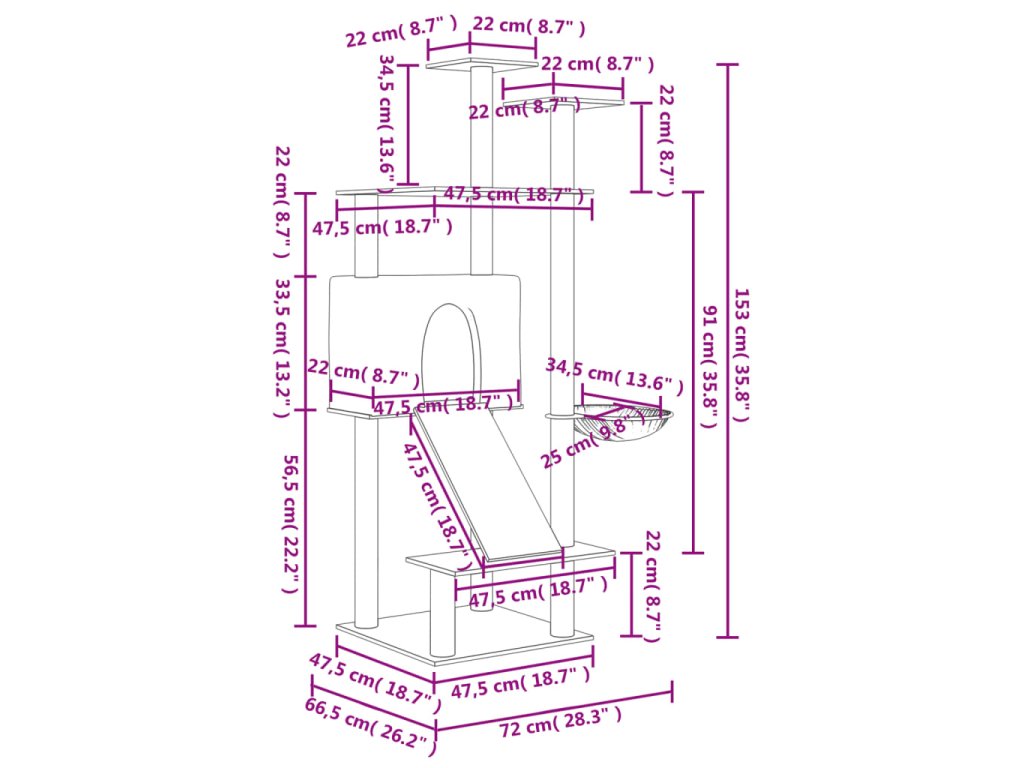 - Komplexná veža pre mačky: Viacúrovňový nábytok pre mačky je navrhnutý s domčekom, košom, rebríkom a plošinami, ktoré vašim mačkám poskytujú dokonalé miesto, kde môžu liezť, sedieť, škrabať sa, schovávať sa a tiež relaxovať.