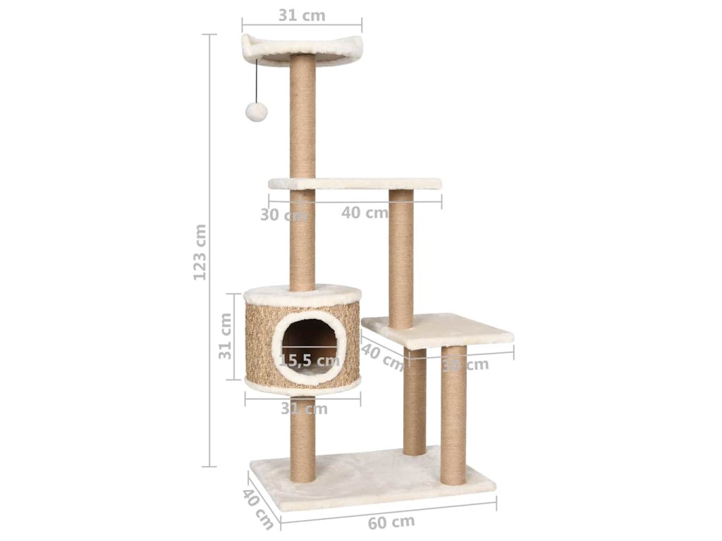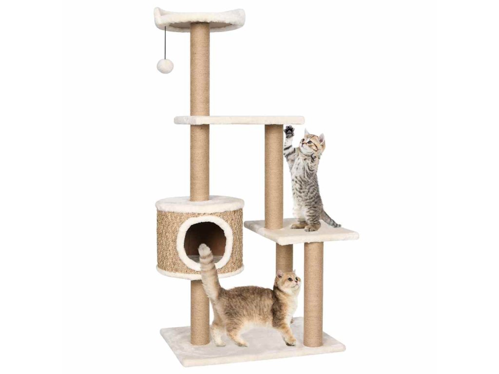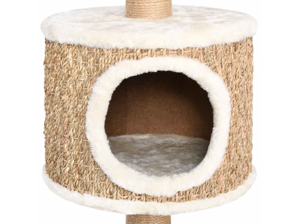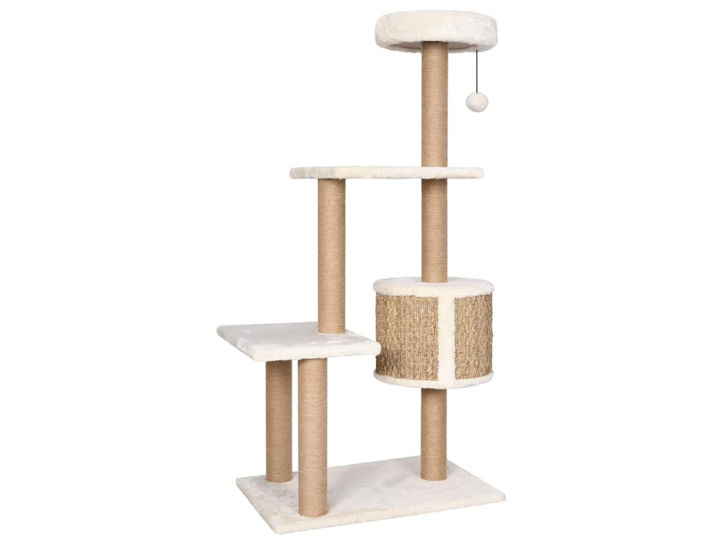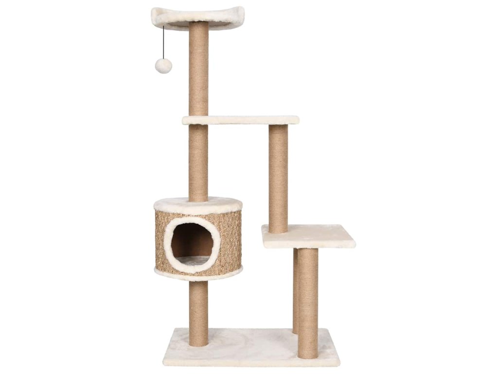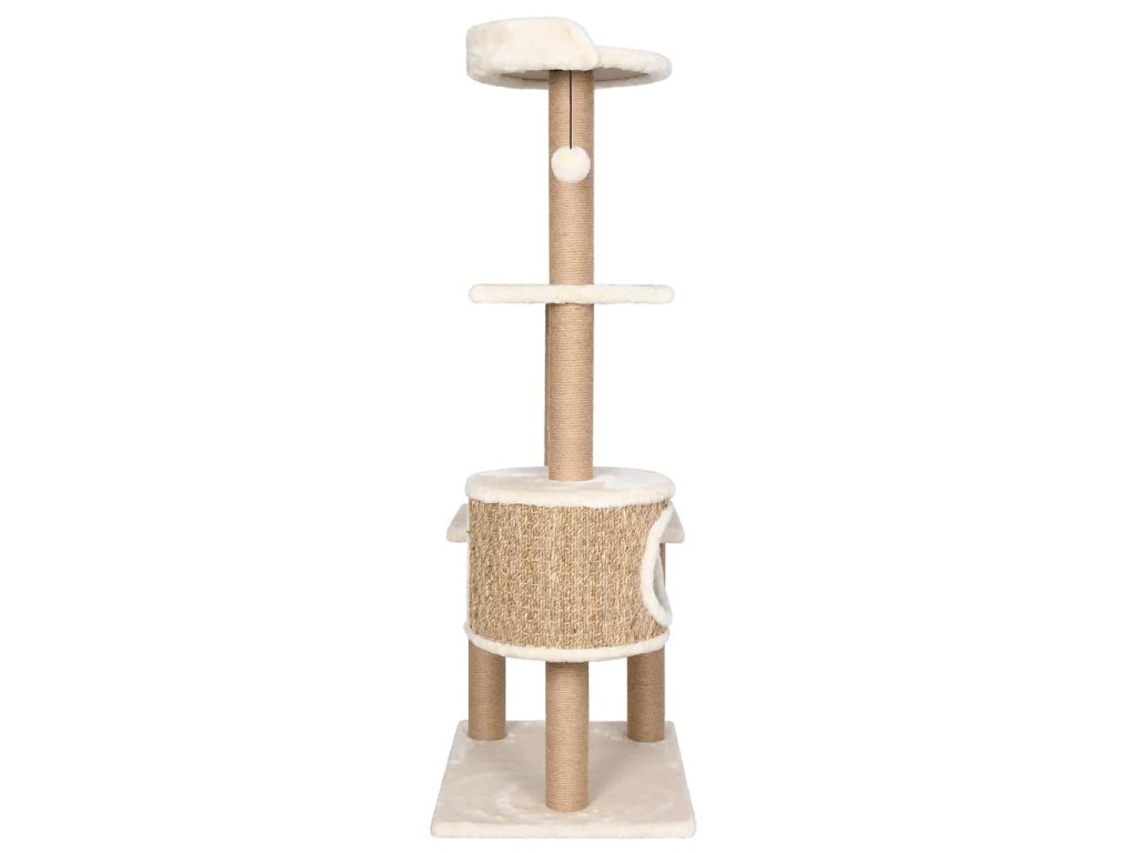 Vysoký mačací strom obsahuje niekoľko platforiem a domček, takže vaše mačky na ňom môžu podľa potreby škriabať, skákať, liezť, ale aj odpočívať. Stĺpiky na škriabanie sú obalené morskou trávou, čo vašim mačacím kamarátom mimoriadne dobre naostrí pazúriky. Má niekoľko platforiem, ktoré mačkám poskytujú útulné miesto na odpočinok alebo spánok. Okrem toho obsahuje aj závesnú loptičku pre extra zábavu.