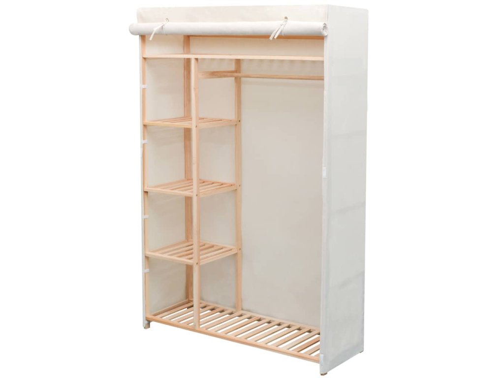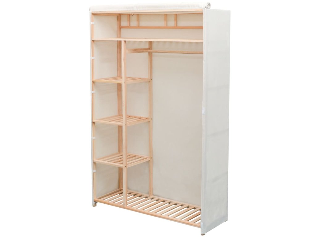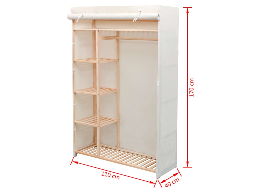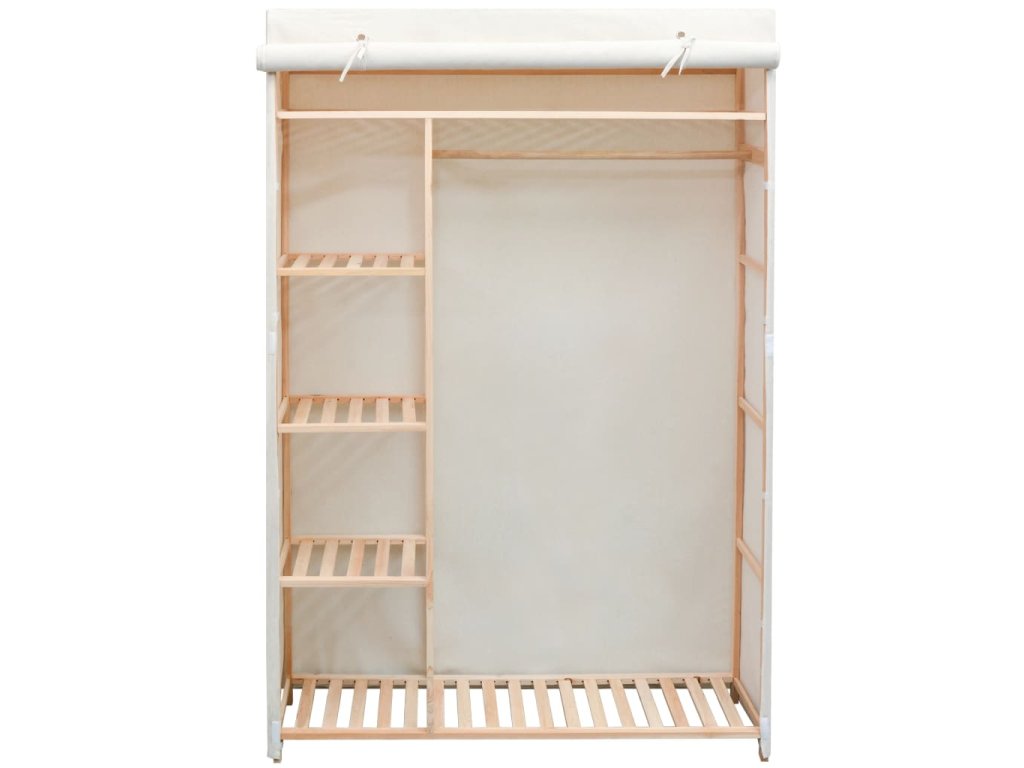 Skriňa má 5 pevných poličiek na uloženie a zorganizovanie topánok, mikín, džínsov, klobúkov, kabeliek, atď. Druhé oddelenie je vybavené závesnou tyčou, ktorú môžete použiť na zavesenie kabátov, šiat, atď. Látka, ktorá sa nachádza okolo celej skrine a ľahko otvárateľné záclonové dvierka zabezpečia, že budú vaše veci chránené od prachu.