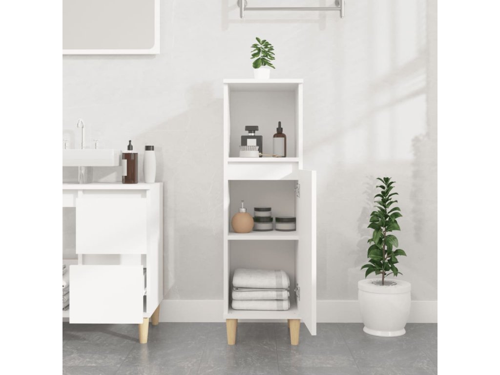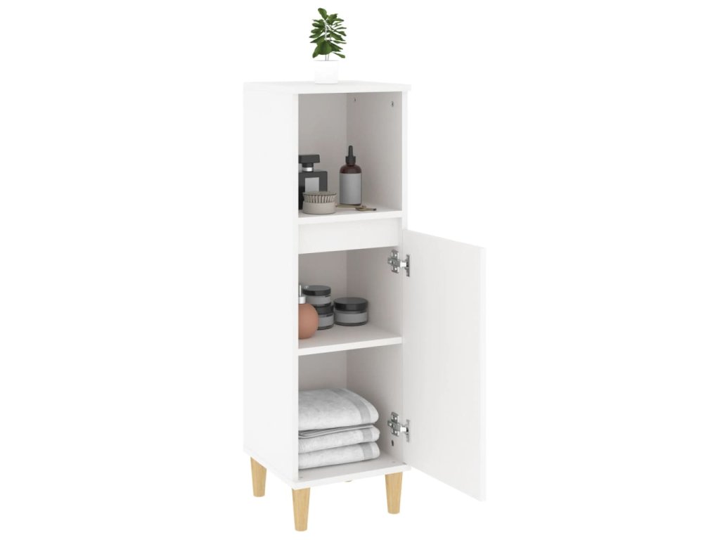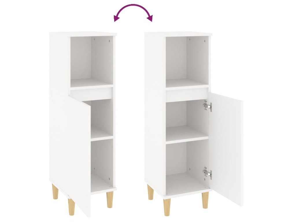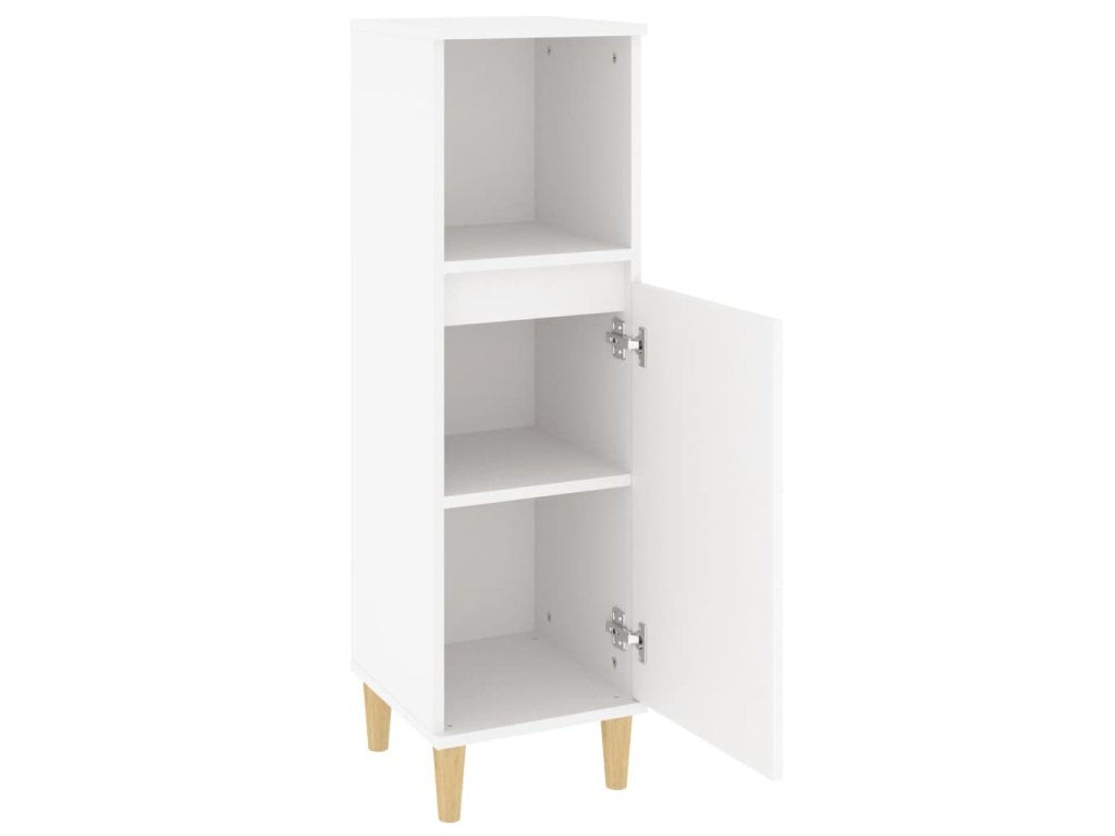 - Drevené nohy: Nohy z masívneho eukalyptu dodávajú skrinke prirodzený a príjemný vzhľad a zároveň zabezpečujú stabilitu.