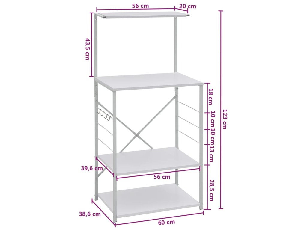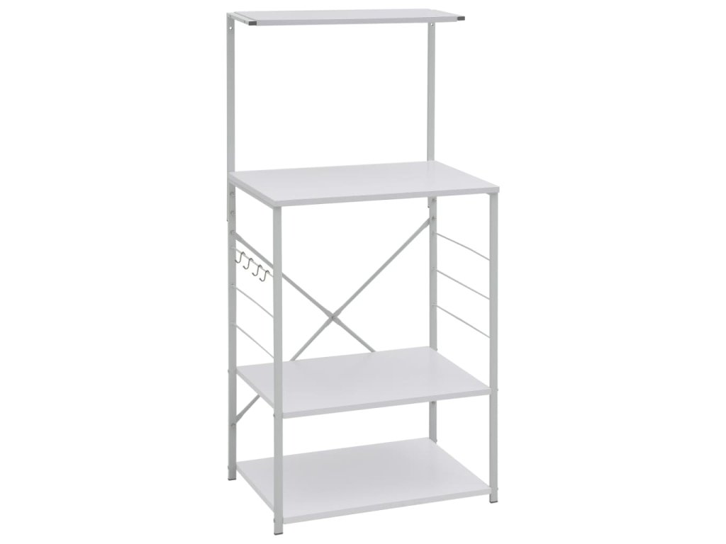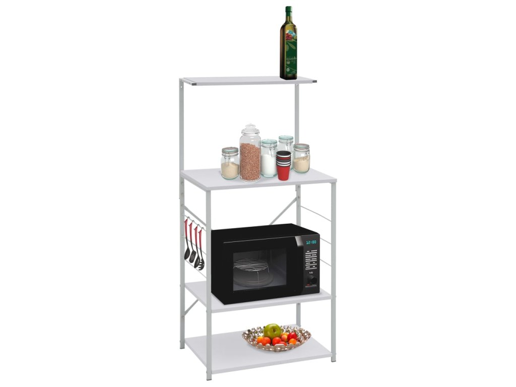 Kuchynský regál je vyrobený z kompozitného dreva a dá sa ľahko očistiť navlhčenou handričkou. Robustná oceľová konštrukcia je odolná voči hrdzi a prináša potrebnú stabilitu. Regál má 4 úrovne, ktoré poskytujú množstvo priestoru na odkladanie rôznych kuchynských potrieb, ako sú toastovače, koreničky, taniere či iné predmety. Na bočnej strane skrinky sa nachádzajú háčiky na ďalšie príslušenstvo, kam si môžete zavesiť kuchynské náčinie. Regál si môžete umiestniť aj do obývačky či kancelárie, kde poslúži na vystavenie zberateľských predmetov, rámikov s fotkami a podobne.