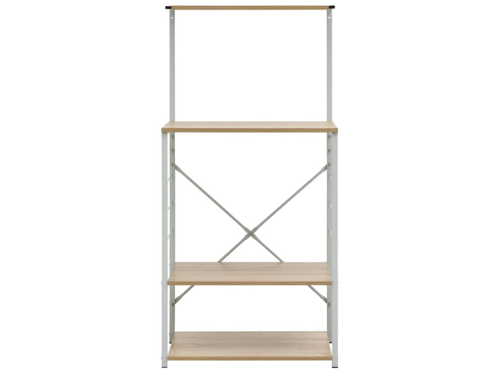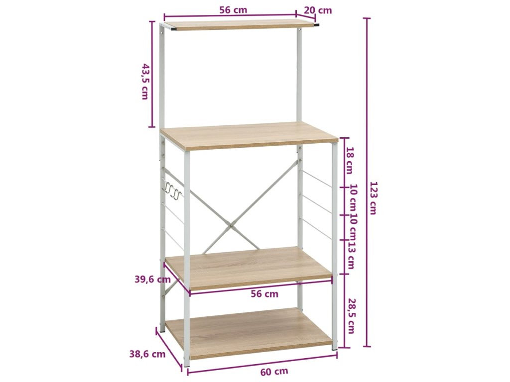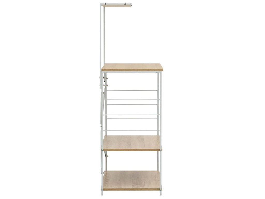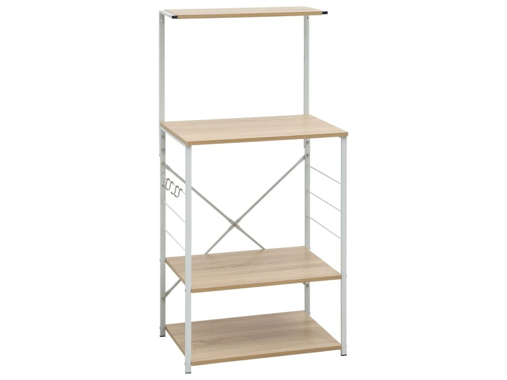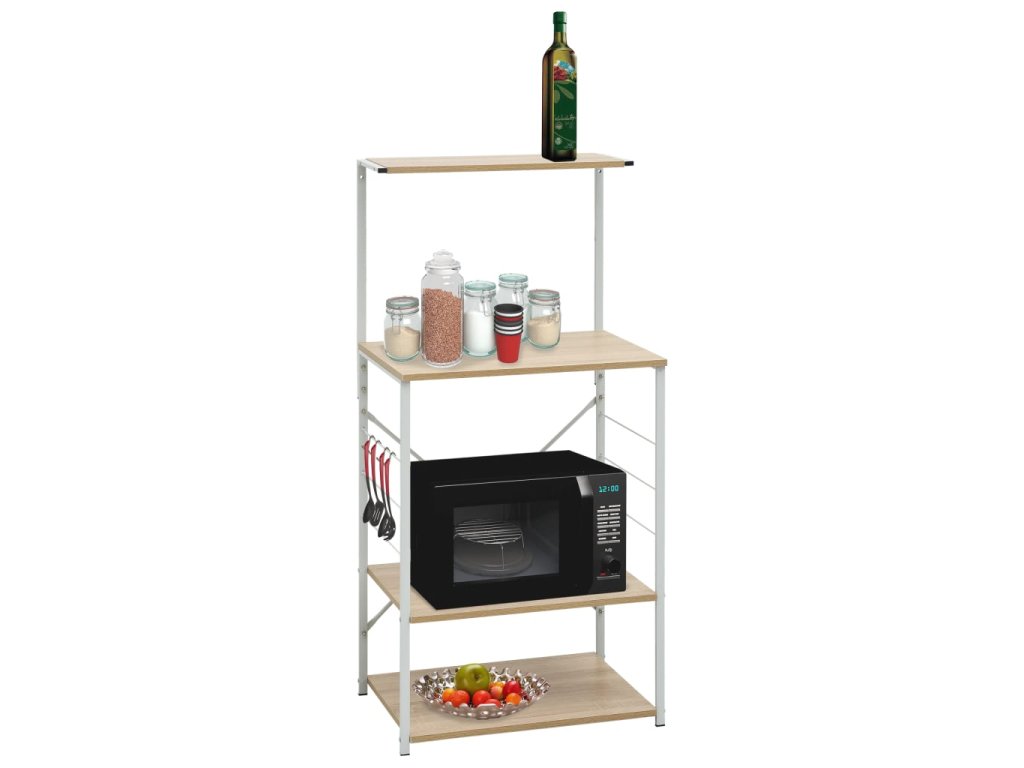 Kuchynský regál je vyrobený z kompozitného dreva a dá sa ľahko očistiť navlhčenou handričkou. Robustná oceľová konštrukcia je odolná voči hrdzi a prináša potrebnú stabilitu. Regál má 4 úrovne, ktoré poskytujú množstvo priestoru na odkladanie rôznych kuchynských potrieb, ako sú toastovače, koreničky, taniere či iné predmety. Na bočnej strane skrinky sa nachádzajú háčiky na ďalšie príslušenstvo, kam si môžete zavesiť kuchynské náčinie. Regál si môžete umiestniť aj do obývačky či kancelárie, kde poslúži na vystavenie zberateľských predmetov, rámikov s fotkami a podobne.