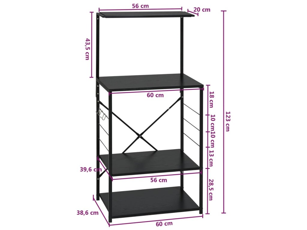 Kuchynský regál je vyrobený z kompozitného dreva a dá sa ľahko očistiť navlhčenou handričkou. Robustná oceľová konštrukcia je odolná voči hrdzi a prináša potrebnú stabilitu. Regál má 4 úrovne, ktoré poskytujú množstvo priestoru na odkladanie rôznych kuchynských potrieb, ako sú toastovače, koreničky, taniere či iné predmety. Na bočnej strane skrinky sa nachádzajú háčiky na ďalšie príslušenstvo, kam si môžete zavesiť kuchynské náčinie. Regál si môžete umiestniť aj do obývačky či kancelárie, kde poslúži na vystavenie zberateľských predmetov, rámikov s fotkami a podobne.