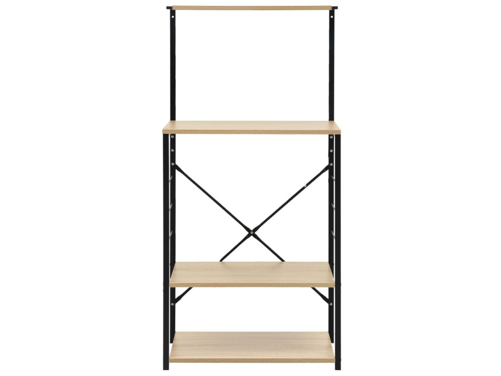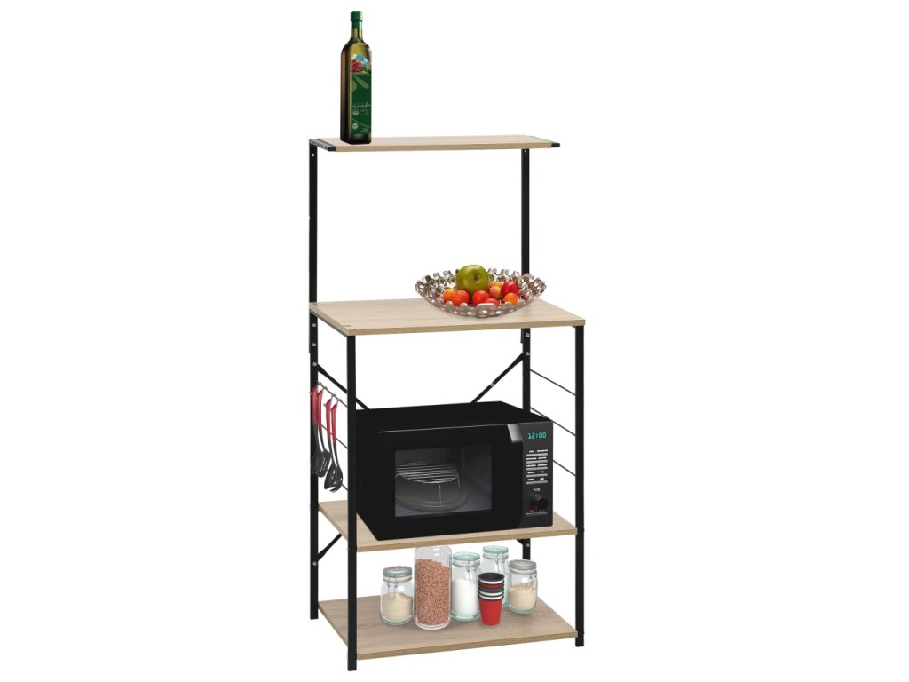 Kuchynský regál je vyrobený z kompozitného dreva a dá sa ľahko očistiť navlhčenou handričkou. Robustná oceľová konštrukcia je odolná voči hrdzi a prináša potrebnú stabilitu. Regál má 4 úrovne, ktoré poskytujú množstvo priestoru na odkladanie rôznych kuchynských potrieb, ako sú toastovače, koreničky, taniere či iné predmety. Na bočnej strane skrinky sa nachádzajú háčiky na ďalšie príslušenstvo, kam si môžete zavesiť kuchynské náčinie. Regál si môžete umiestniť aj do obývačky či kancelárie, kde poslúži na vystavenie zberateľských predmetov, rámikov s fotkami a podobne.