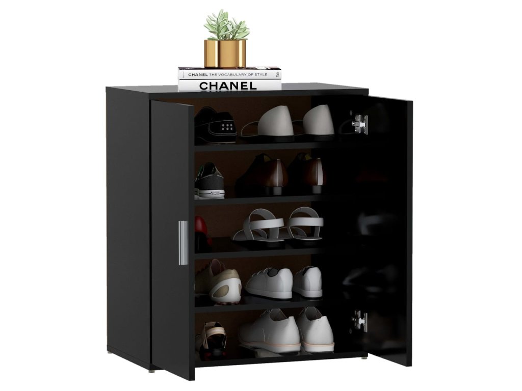 Táto skrinka do chodby je vyrobená z kompozitného dreva, ktoré je mimoriadne trvácne a robustné. Skrinka na topánky má 5 políc, ktoré poskytujú dostatok priestoru na prehľadné odkladanie topánok. Regál na topánky má 2 dvierka, ktoré ochránia vaše topánky pred prachom a zároveň sa postarajú o to, aby ste topánky nemali stále na očiach. Skrinku navyše môžete podľa potreby upevniť k zemi alebo k stene.
