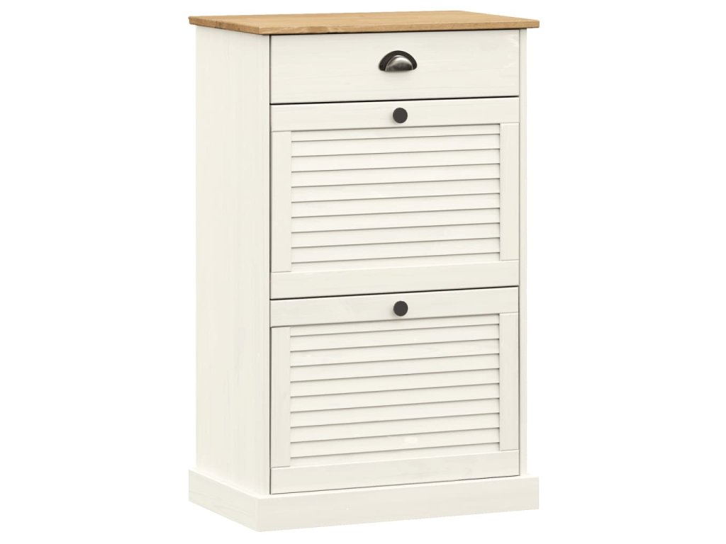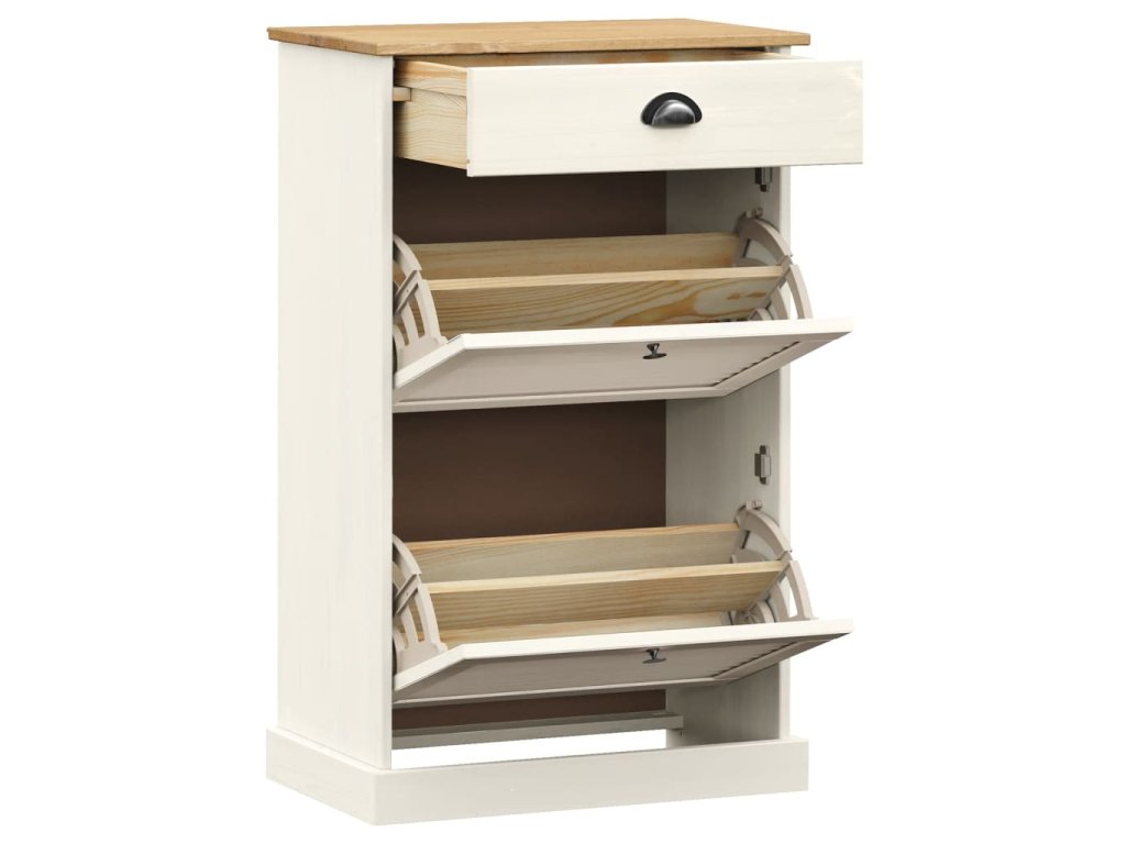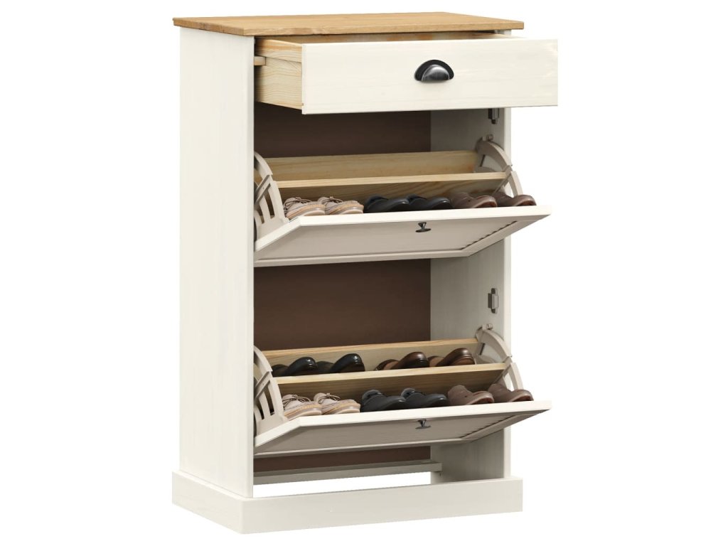 - Borovicový masív: Borovicový masív je krásny prírodný materiál. Borovicové drevo má rovnú kresbu a nachádzajú sa na ňom hrče, ktoré tomuto materiálu dodávajú charakteristický rustikálny vzhľad. Úložný priestor na topánky je vyrobený z masívneho borovicového dreva a je odolný a pevný.