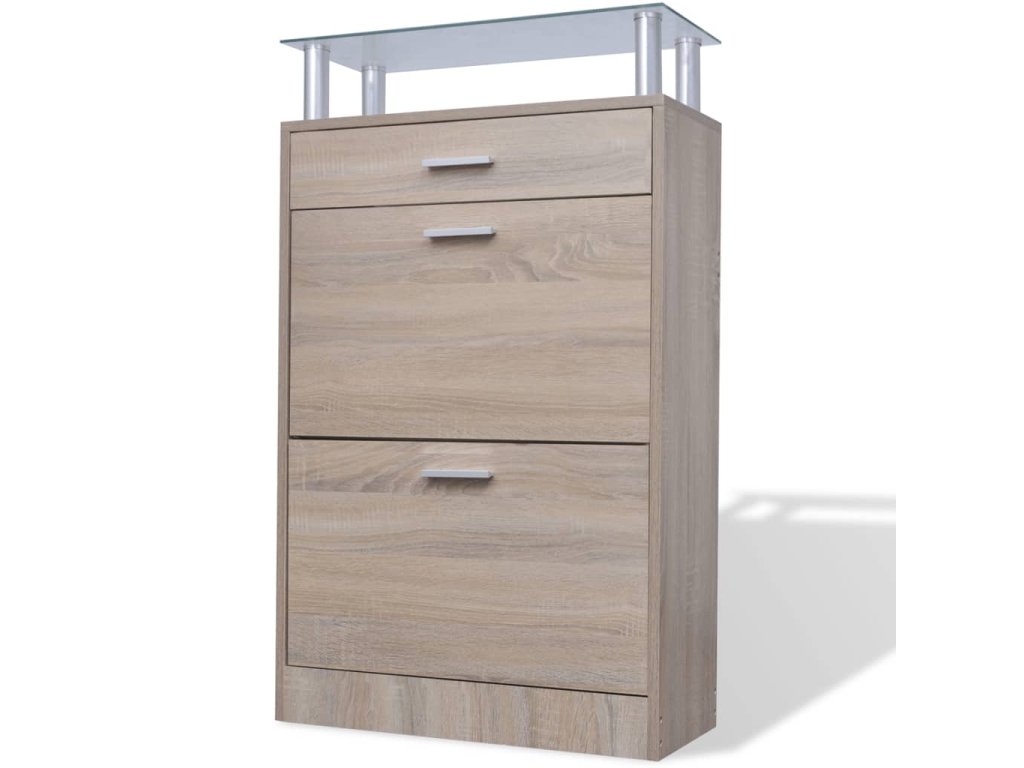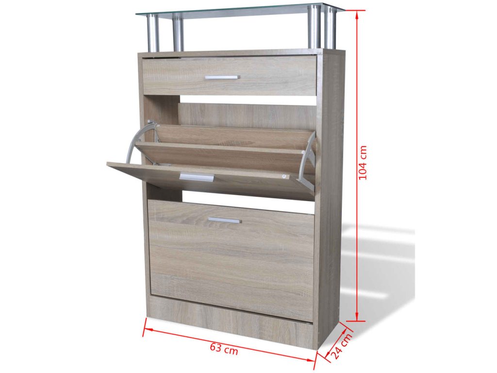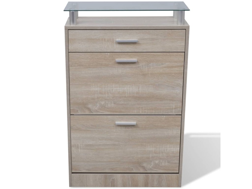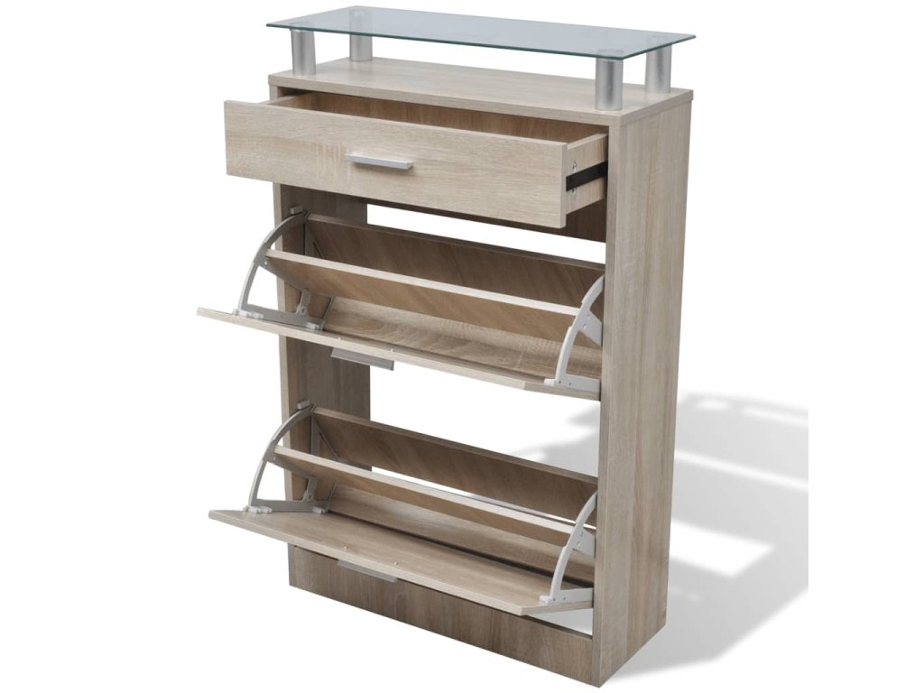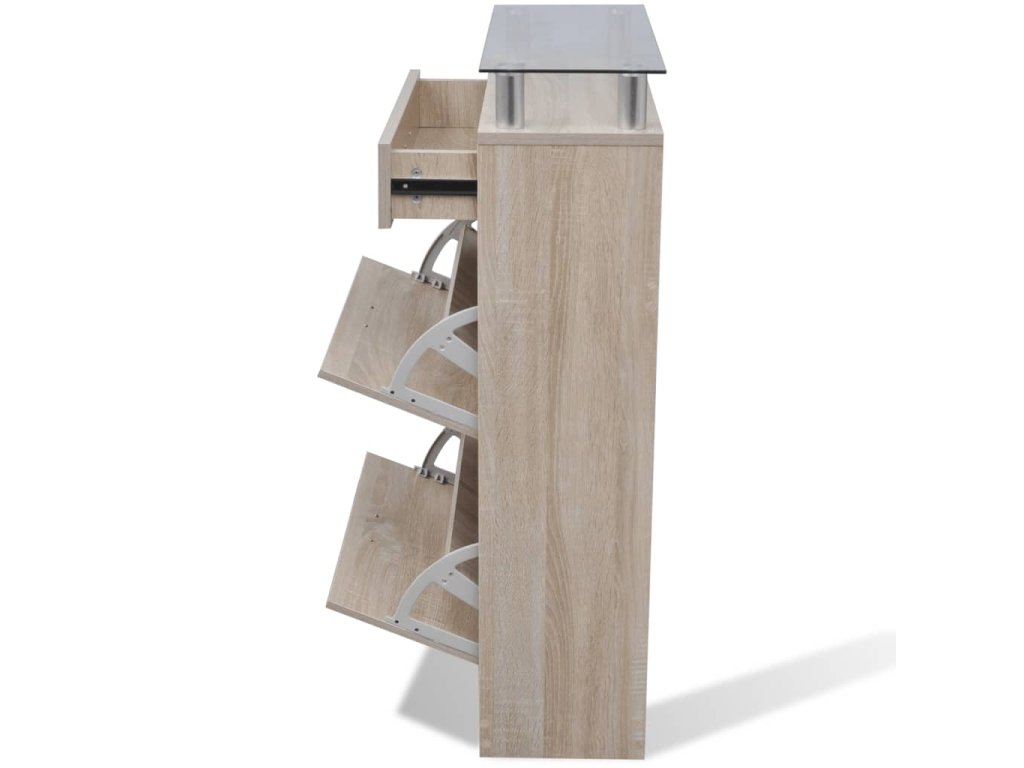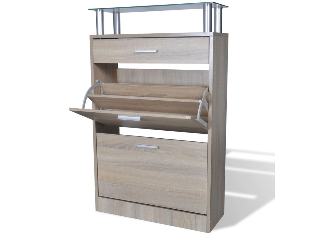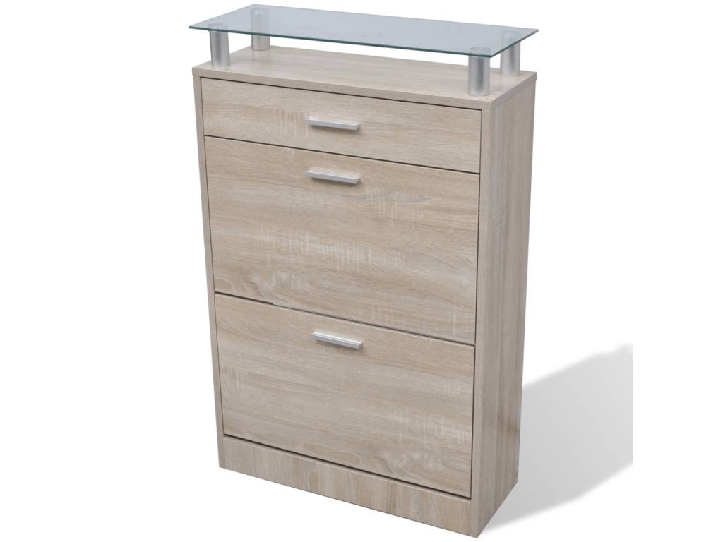 Táto drevená skrinka na topánky so zásuvkou, sklenenou policou navrchu a 2 veľkými úložnými priečinkami má jednoduchý, no štýlový dizajn. Už sa nebudete potkýnať o topánky rozhádzané po zemi.
