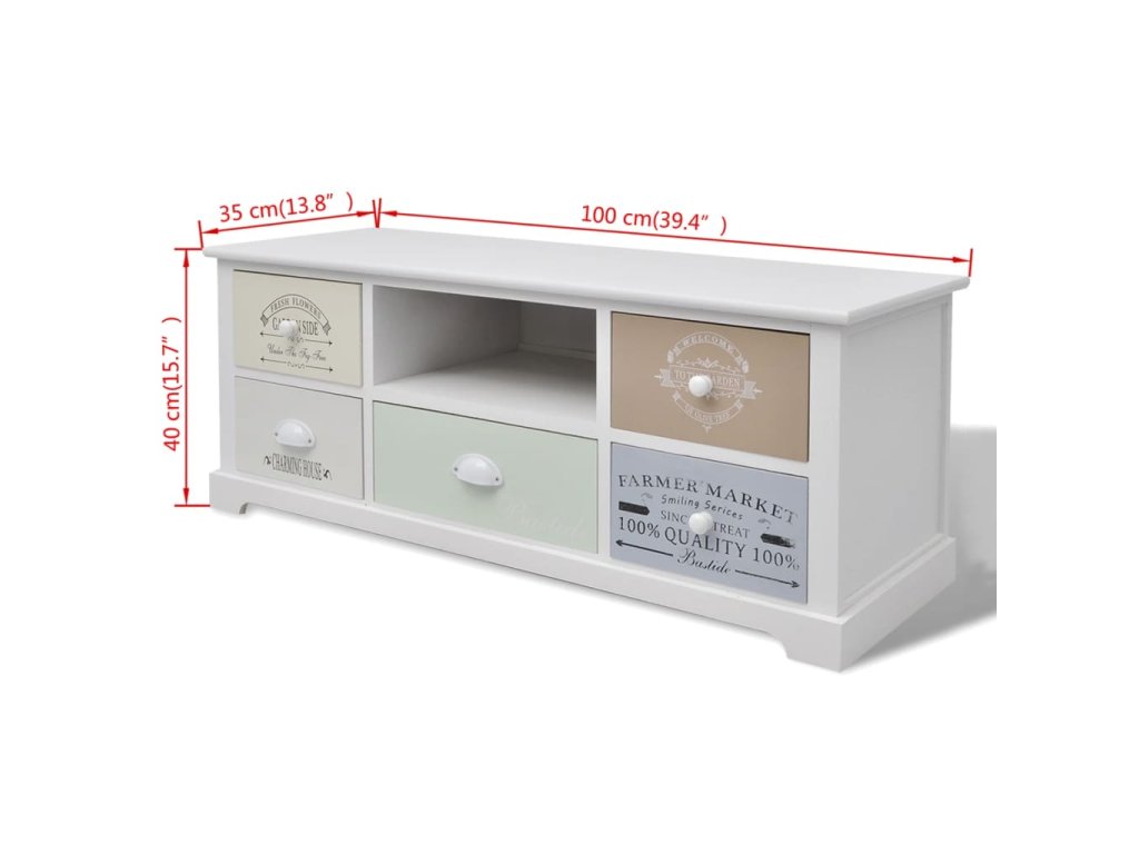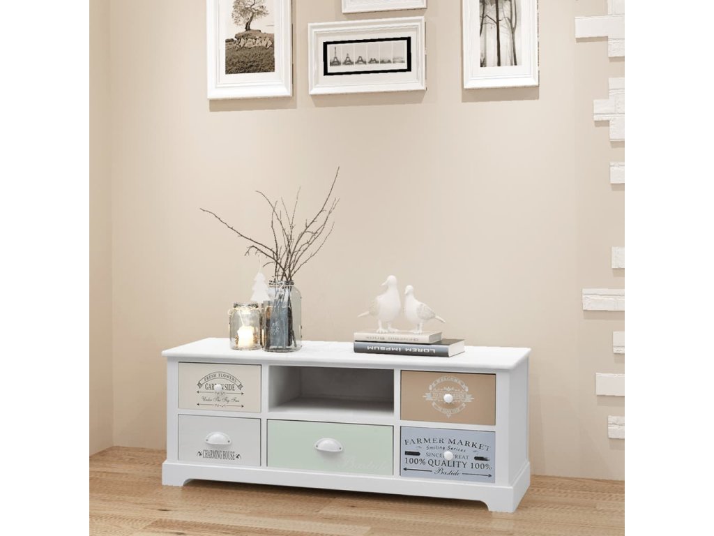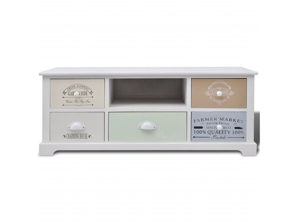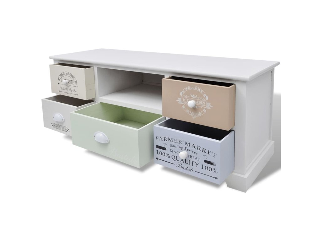 Táto príručná skrinka so starožitným dizajnom má 5 zásuviek, ktoré sa hladko vysúvajú a ktoré poskytujú množstvo úložného priestoru na vaše osobné veci, a tak budete mať v izbe vždy poriadok. Stredná zásuvka je natretá elegantnou svetlo zelenou farbou. 4 bočné zásuvky s potlačou vo vintage vidieckom štýle dodávajú nízkej skrinke rustikálny pôvab. Bočné zásuvky sa navyše dajú medzi sebou vymieňať. Nad strednou zásuvkou nájdete priestranný priečinok na odkladanie multimédií, kníh, časopisov či iných predmetov, ktoré chcete mať poruke.