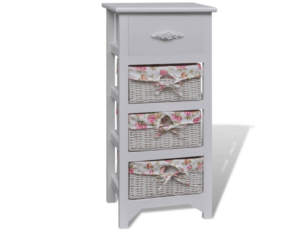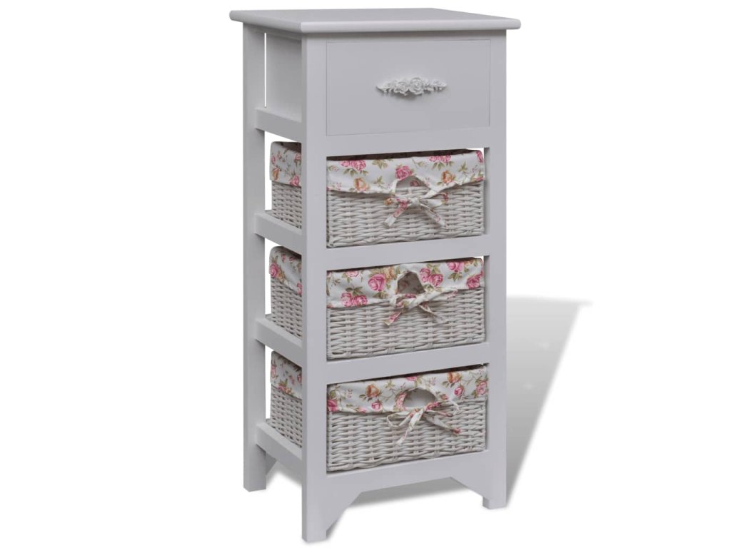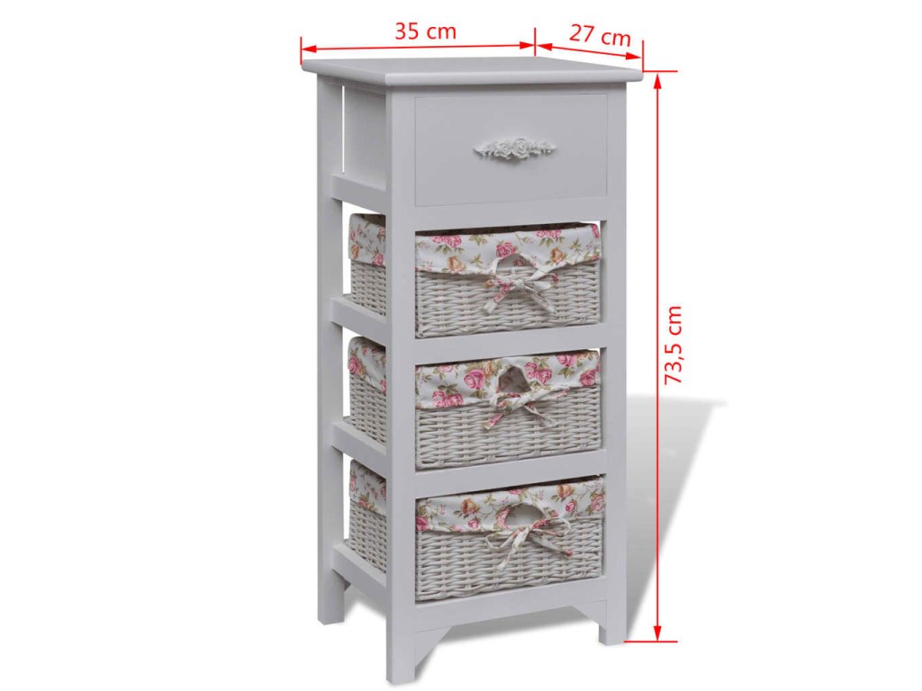 Drevená skrinka s jednou zásuvkou a troma košíkmi je vyrobená z dreva prvotriednej kvality a má jednoduchý a zároveň štýlový dizajn. Poskytuje dostatok priestoru na odkladanie rôznych predmetov a okrem toho dodá vášmu príbytku nádych romantiky.